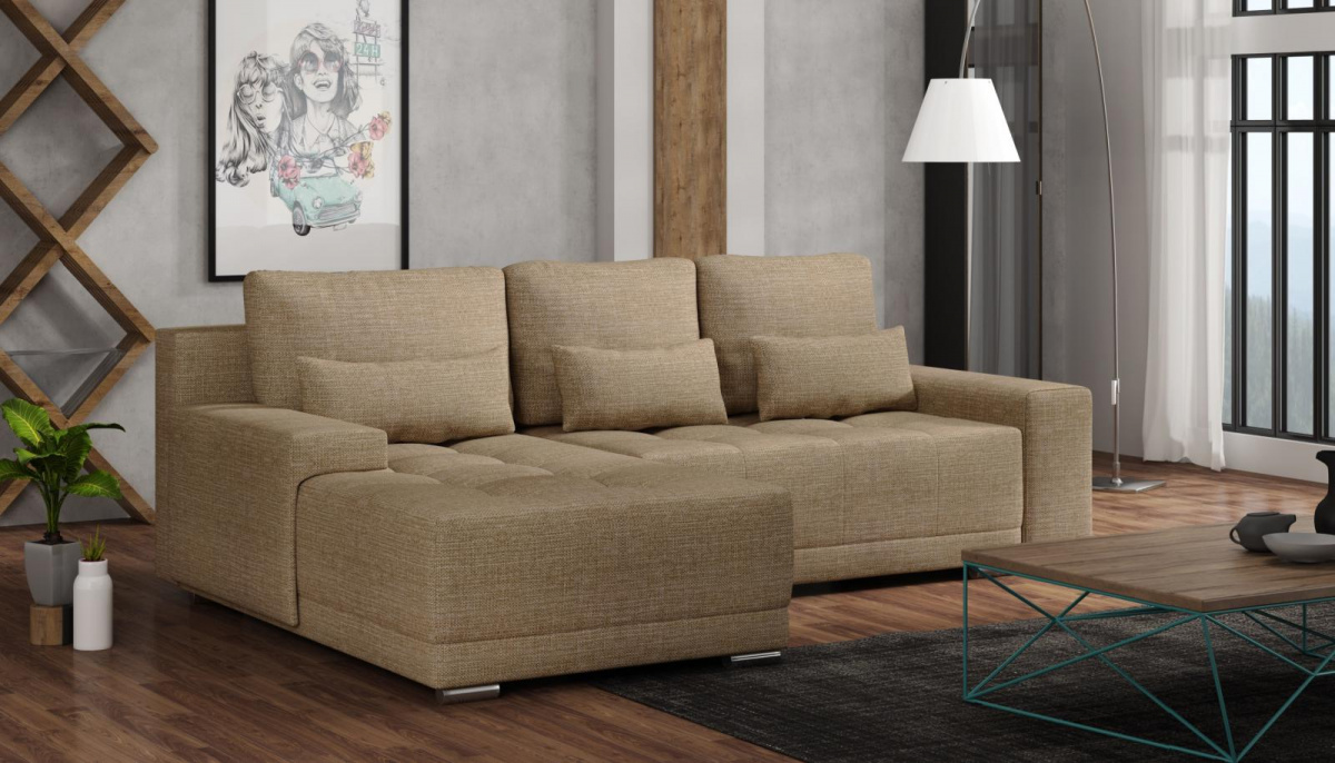 Sedací souprava Lacom výborně zapadne do moderního i klasického interiéru. Její velkou předností je pohodlí, praktičnost a univerzální použití. Tzn. že si ji můžete podle potřeby sestavit jako levou nebo pravou, což je výhoda při zařizování obývacího pokoje. Nemusíte přemýšlet do jakého rohu postavíte sedací soupravu, jednoduše ji podle potřeby přizpůsobíte. Sedací souprava je rozkládací a může tak sloužit k občasnému přespání Vaší návštěvy. Samozřejmostí je i praktický úložný prostor, který můžete využít např. na lůžkoviny. Sedací souprava je potažena kvalitní látkou a nabízíme ji v několika trendy odstínech. Výplň sedáků tvoří kombinace pružin s kvalitní PUR pěnou, což zajišťuje velmi pohodlné sezení. Součástí sedací soupravy jsou tři velké opěrné a tři malé dekorační polštáře. Vyobrazené doplňky a dekorace nejsou v ceně.