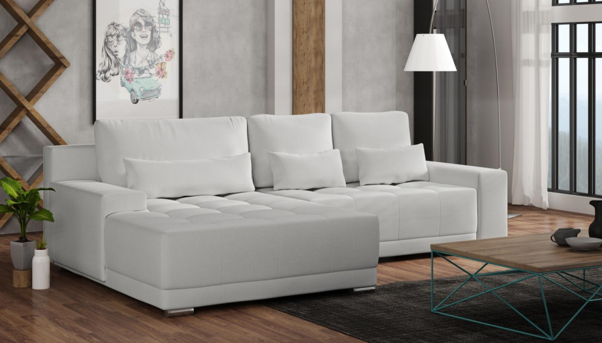 Sedací souprava Lacom MAX výborně zapadne do moderního i klasického interiéru. Její velkou předností je pohodlí, praktičnost a univerzální použití. Tzn. že si ji můžete podle potřeby sestavit jako levou nebo pravou, což je výhoda při zařizování obývacího pokoje. Nemusíte přemýšlet do jakého rohu postavíte sedací soupravu, jednoduše ji podle potřeby přizpůsobíte. Sedací souprava je rozkládací a může tak sloužit k občasnému přespání Vaší návštěvy. Samozřejmostí je i praktický úložný prostor, který můžete využít např. na lůžkoviny. Sedací souprava je potažena kvalitní látkou a nabízíme ji v několika trendy odstínech. Výplň sedáků tvoří kombinace pružin s kvalitní PUR pěnou, což zajišťuje velmi pohodlné sezení. Součástí sedací soupravy jsou tři velké opěrné a tři malé dekorační polštáře. Vyobrazené doplňky a dekorace nejsou v ceně.