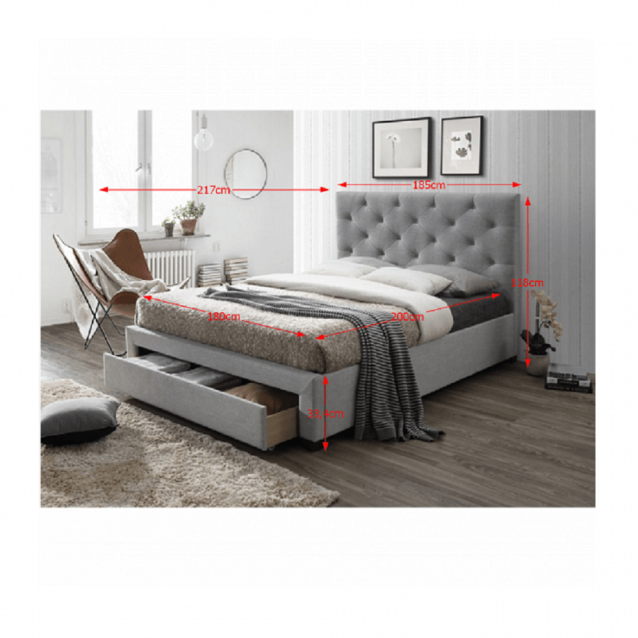 Luxusní moderní postel s vysokým prošívaným čelem, úložným prostorem a zarolovaným roštem. Materiál: látka / dřevo Barva: šedá / wenge Rozměry (ŠxHxV): 185x217x118cm, plocha na spaní (ŠxH): 180x200 cm Možnost dokoupení matrace v rozměru 180x200 cm Dodávané v demontu.