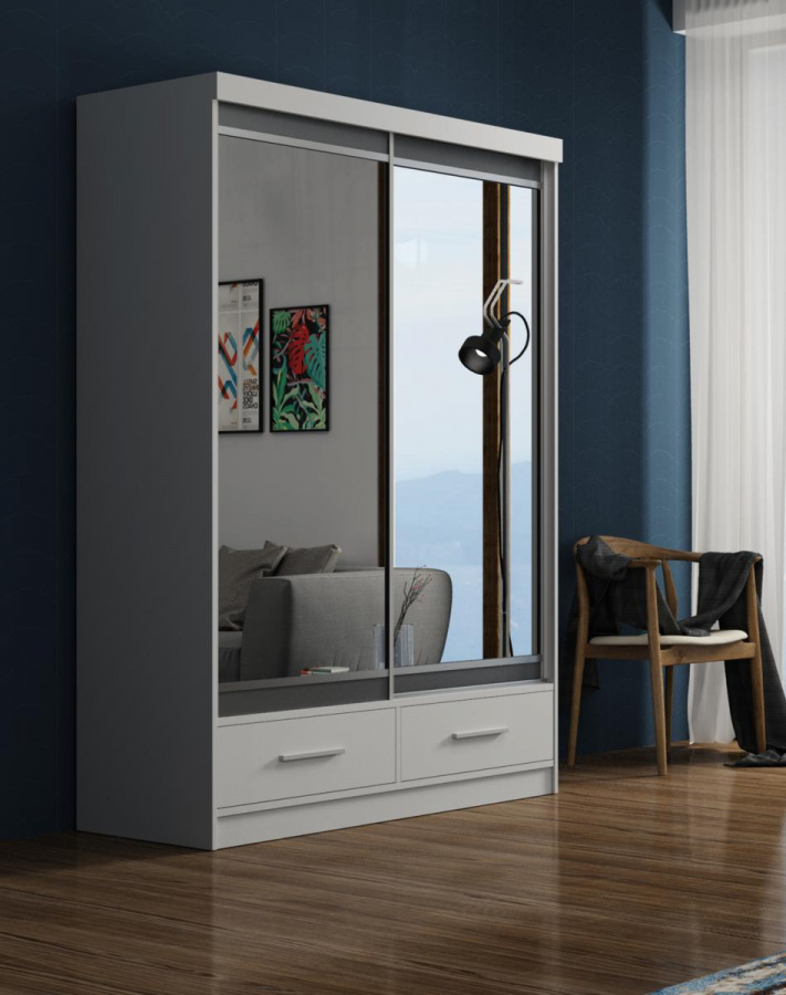 Šatní skříň Margita je vyrobena z lamina. Má posuvné dveře, které šetří prostor a na dveřích skříně jsou zrcadla, které místnost opticky zvětší a prosvětlí. Díky svému vnitřnímu uspořádání (vyobrazeno v doplňkových fotografiích) nabízí skříň dostatek úložného prostoru. Skříň je také vybavena zásuvkami, do kterých můžete uložit drobnosti. Skříň Margo najde uplatnění např. v dětském nebo studentském pokoji, v předsíni, v ložnici i v obývacím pokoji. Nabízíme ji v rozměrech 120 cm, 150 cm, 200 cm a 250 cm. Všechny nabízené rozměry jsou dostupné v černé a bílé barvě a dále také v dekoru sonoma. Skříň je dodávána v demontu a součástí je montážní plánek včetně všech potřebných spojovacích prvků. Vyobrazené doplňky a dekorace nejsou v ceně.
