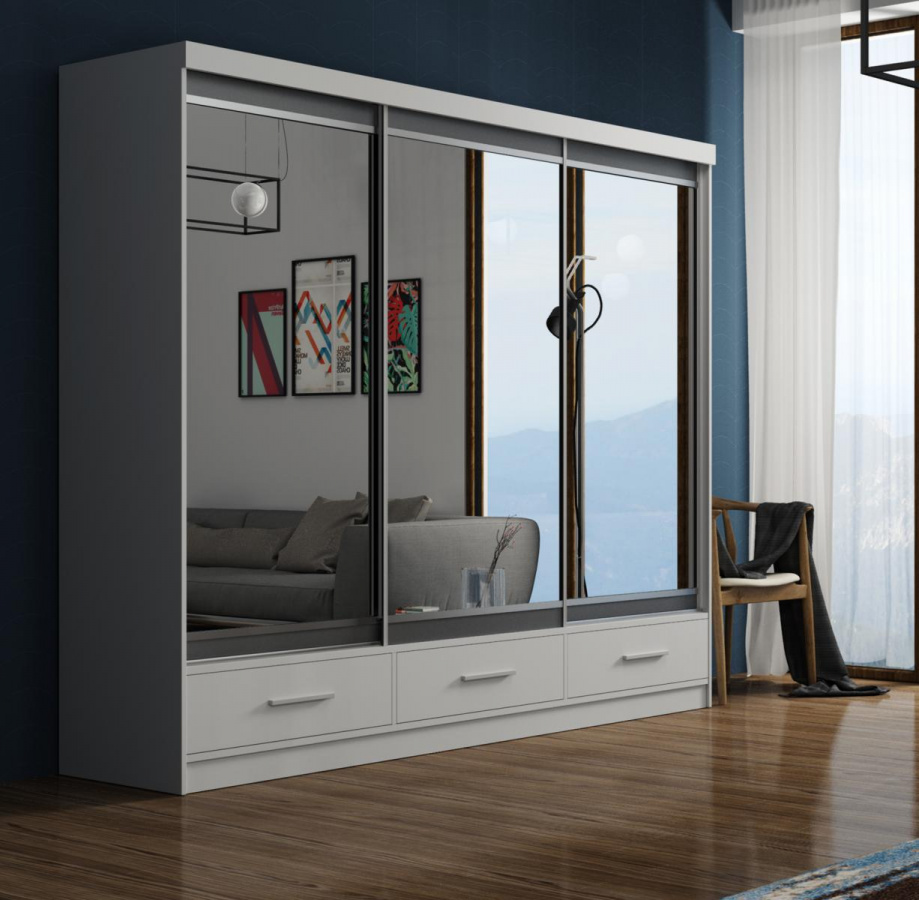 Šatní skříň Margita je vyrobena z lamina. Má posuvné dveře, které šetří prostor a na dveřích skříně jsou zrcadla, které místnost opticky zvětší a prosvětlí. Díky svému vnitřnímu uspořádání (vyobrazeno v doplňkových fotografiích) nabízí skříň dostatek úložného prostoru. Skříň je také vybavena zásuvkami, do kterých můžete uložit drobnosti. Skříň Margo najde uplatnění např. v dětském nebo studentském pokoji, v předsíni, v ložnici i v obývacím pokoji. Nabízíme ji v rozměrech 120 cm, 150 cm, 200 cm a 250 cm. Všechny nabízené rozměry jsou dostupné v černé a bílé barvě a dále také v dekoru sonoma. Skříň je dodávána v demontu a součástí je montážní plánek včetně všech potřebných spojovacích prvků. Vyobrazené doplňky a dekorace nejsou v ceně. ÚVODNÍ FOTOGRAFIE JE ILUSTRAČNÍ. SKŘÍŇ BUDE DODÁNA V ČERNÉ BARVĚ.