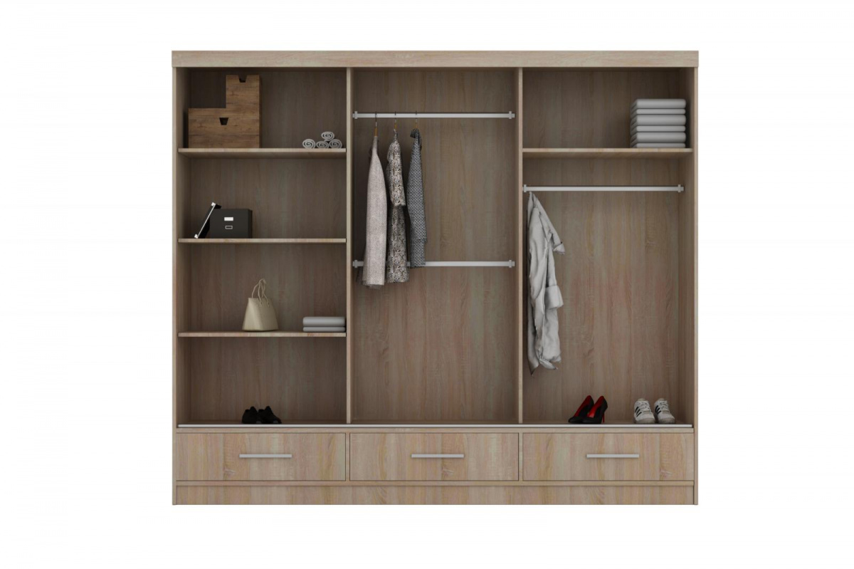 Šatní skříň Margita je vyrobena z lamina. Má posuvné dveře, které šetří prostor a na dveřích skříně jsou zrcadla, které místnost opticky zvětší a prosvětlí. Díky svému vnitřnímu uspořádání (vyobrazeno v doplňkových fotografiích) nabízí skříň dostatek úložného prostoru. Skříň je také vybavena zásuvkami, do kterých můžete uložit drobnosti. Skříň Margo najde uplatnění např. v dětském nebo studentském pokoji, v předsíni, v ložnici i v obývacím pokoji. Nabízíme ji v rozměrech 120 cm, 150 cm, 200 cm a 250 cm. Všechny nabízené rozměry jsou dostupné v černé a bílé barvě a dále také v dekoru sonoma. Skříň je dodávána v demontu a součástí je montážní plánek včetně všech potřebných spojovacích prvků. Vyobrazené doplňky a dekorace nejsou v ceně. ÚVODNÍ FOTOGRAFIE JE ILUSTRAČNÍ. SKŘÍŇ BUDE DODÁNA V ČERNÉ BARVĚ.