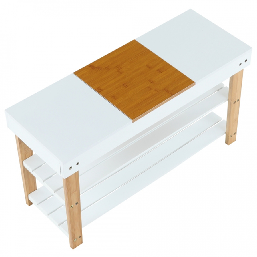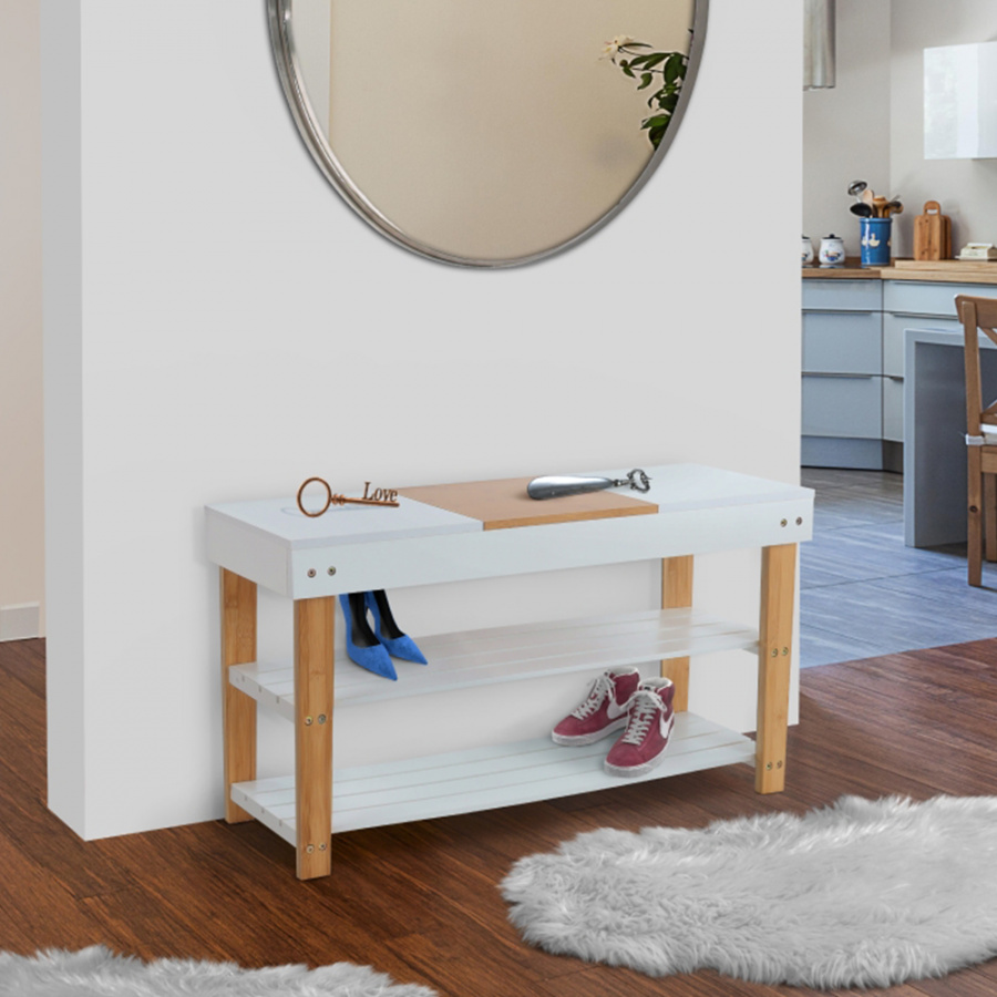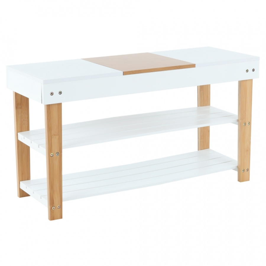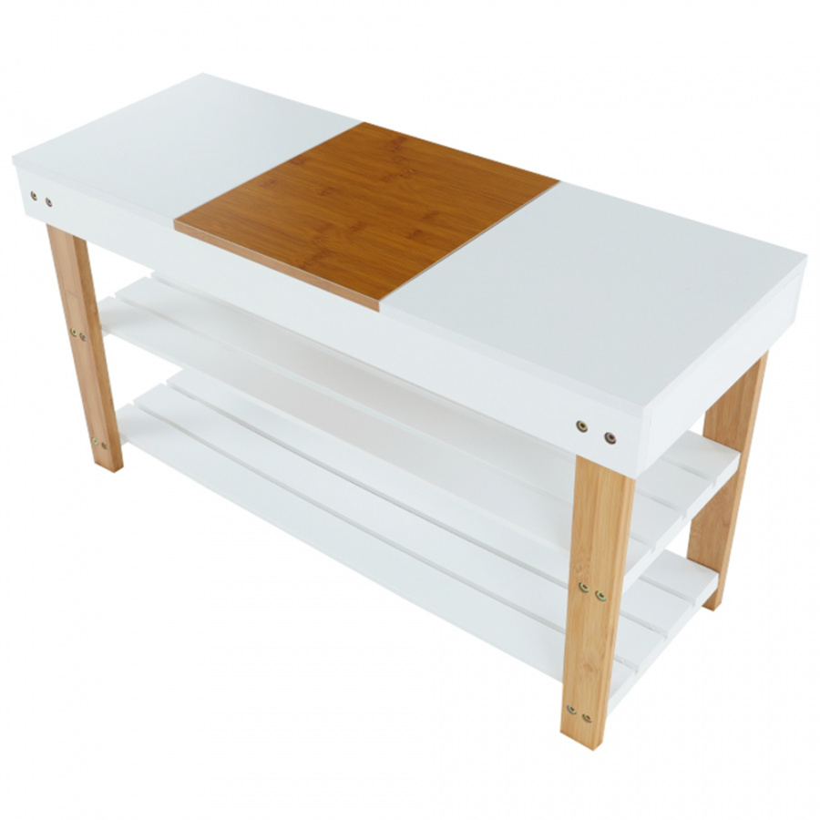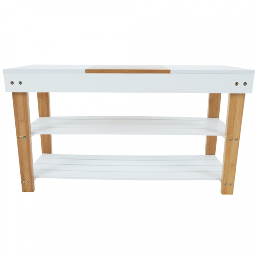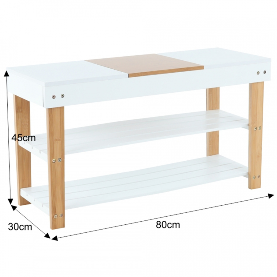 Karmel dvoupolicový elegantní botník s úložným prostorem ve vrchní části. Bílá barva v kombinaci s bambusovou. Materiál MDF / bambus. Rozměry (ŠxHxV): 80x30x45 cm Tloušťka materiálu: 15 mm