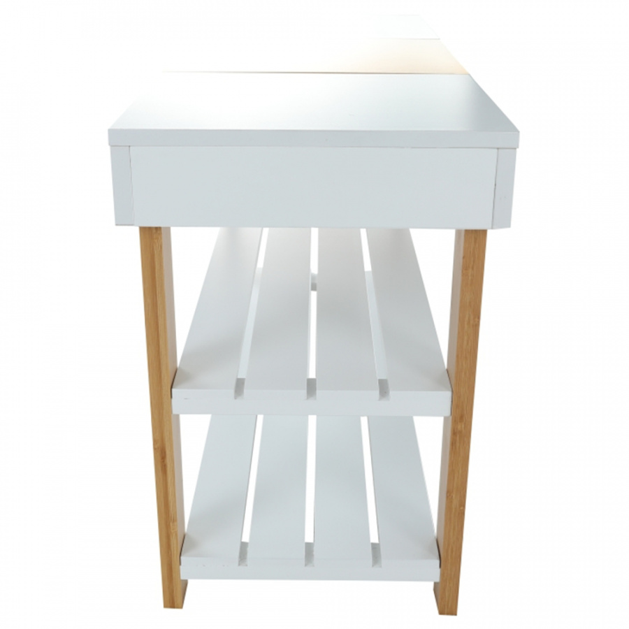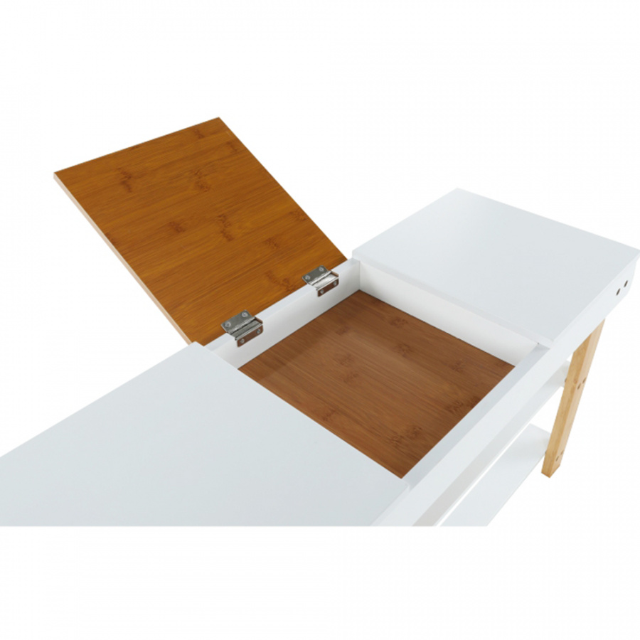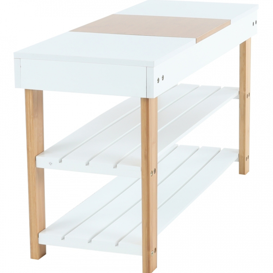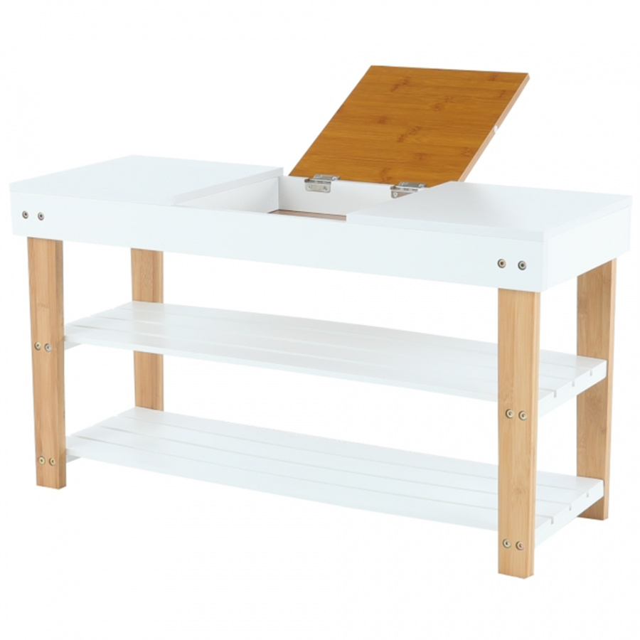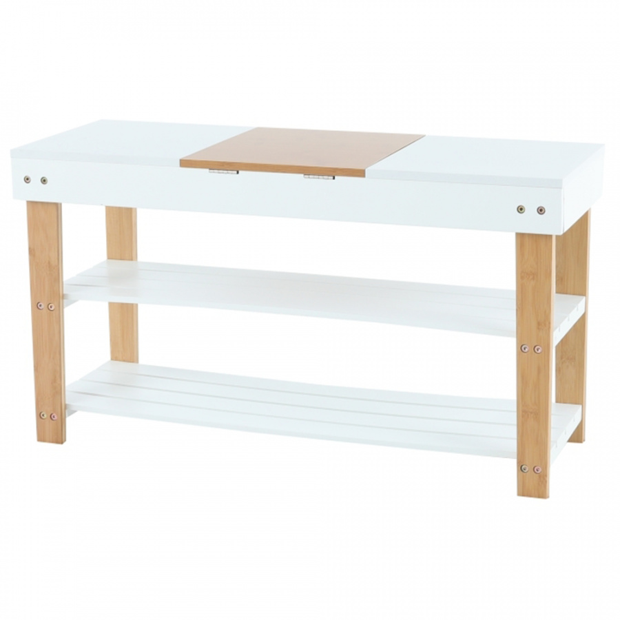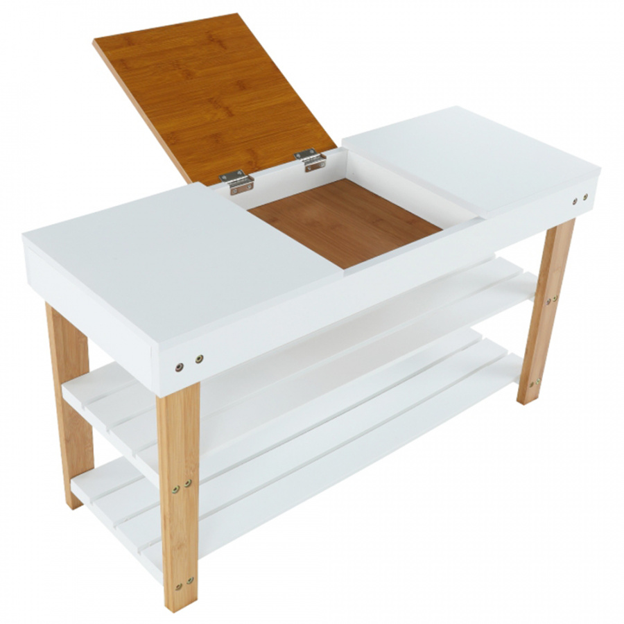 Karmel dvoupolicový elegantní botník s úložným prostorem ve vrchní části. Bílá barva v kombinaci s bambusovou. Materiál MDF / bambus. Rozměry (ŠxHxV): 80x30x45 cm Tloušťka materiálu: 15 mm