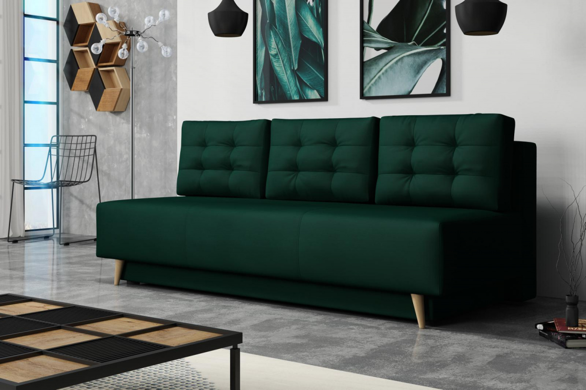 Pohovka Sebastian je elegantním kouskem sedacího nábytku s nádechem RETRO designu a výborně zapadne do každého interiéru. Retro design podtrhují zešikmené dřevěné nohy a látkové knoflíky na opěrných polštářích. Pohovka je rozkládací a samozřejmostí je i nepostradatelný úložný prostor. Jednoduchým rozložením pomocí automatu vznikne dostatečně prostorné lůžko občasnému přespání Vaší návštěvy. Výpň sedáku tvoří pružiny bonell a kvalitní PUR pěna. Pohovka je celočalouněná, takže ji můžete umístit i do prostoru. Výborně se hodí do obývacího pokoje, do pracovny či pokoje pro hosty. Pohovku nabízíme v několika trendy barvách. Vyobrazené dopňky a dekorace nejsou v ceně. Zobrazení barev produktu na fotograii se může nepatrně lišit od skutečnosti.