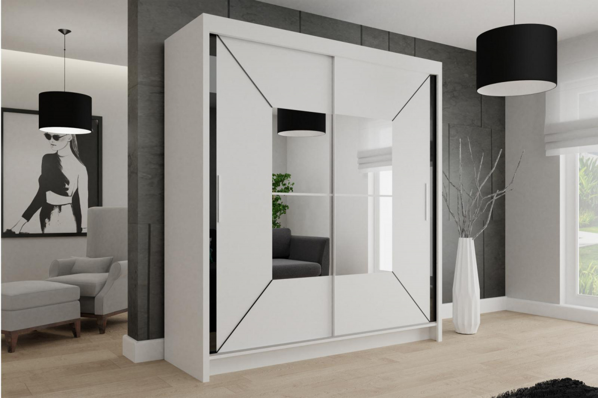 Skříň s posuvnými dveřmi Mario je vyrobena z kvalitního lamina. Dveře skříně jsou osazeny zrcadlem a na bocích jsou ozdobné pásky v černém lesku. Tyto doplňky dodávají skříni originální a elegantní vzhled. Díky svému vnitřnímu uspořádání nabízí dostatek úložného prostoru, posuvné dveře šetří prostor a zrcadlo ho opticky zvětší a prosvětlí. Skříň najde uplatnění v ložnici, dětském nebo studentském pokoji, v předsíni i kanceláři. Nabízíme ji v rozměrech 120 cm, 150 cm,180 cm a 200 cm. Všechny nabízené rozměry jsou dostupné v bílé barvě a dále také v dekoru sonoma. Skříň je dodávána v demontu a součástí je montážní plánek včetně všech potřebných spojovacích prvků. Vyobrazené dekorace nejsou v ceně. ÚVODNÍ FOTOGRAFIE JE ILUSTRAČNÍ. SKŘÍŇ BUDE DODÁNA V DEKORU SONOMA.