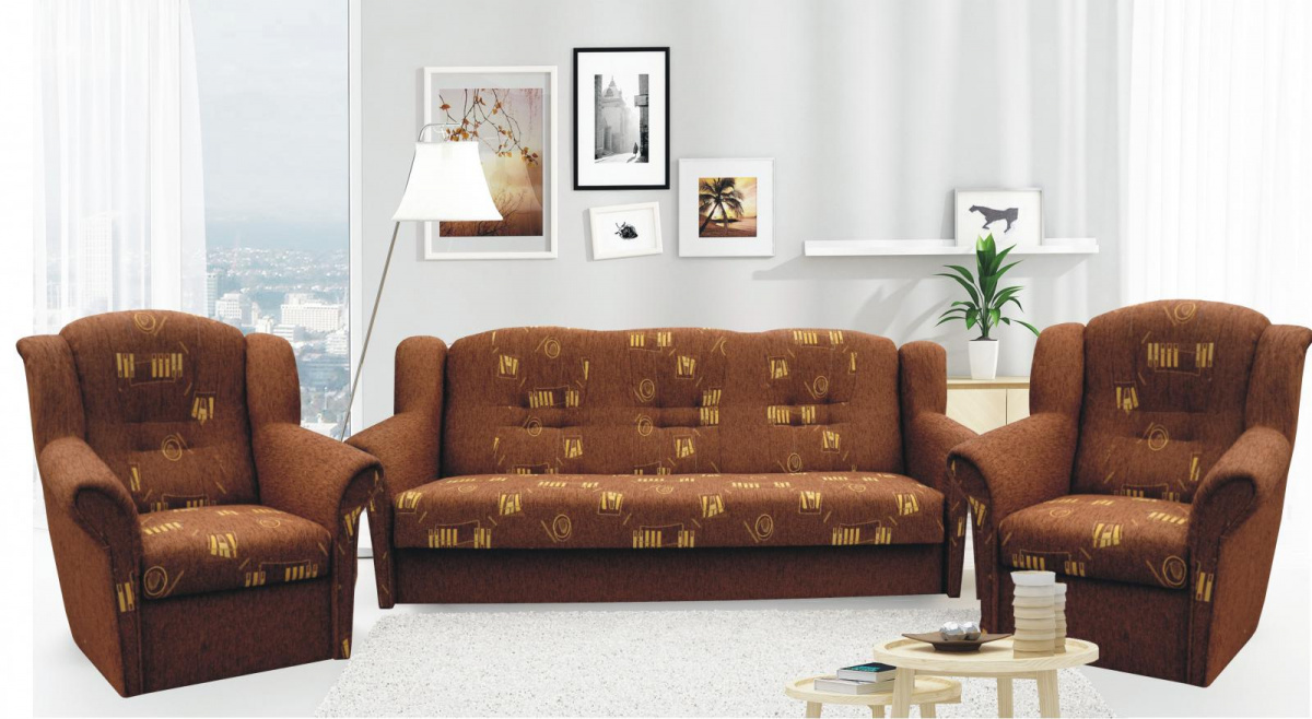 Agata je velmi oblíbeným klasickým modelem sedací soupravy v provedení 3F+1+1. Je velmi pohodlná a zároveň praktická. Sedací souprava je rozkládací a samozřejmostí je i úložný prostor. Jednoduchým rozkladem pomocí systému "klik klak" vznikne lůžko k příležitostnému přespání Vaší návštěvy. Sedací souprava je potažena kvalitní látkou a nabízíme ji v několika barvách. Výpň sedáků tvoří pružiny v kombinaci s kvalitní PUR pěnou. Tato kombinace zajistí velmi pohodlné sezení. Cena sedací soupravy je uvedena za rozkládací trojsed a dvě křesla.