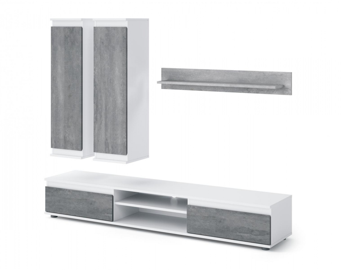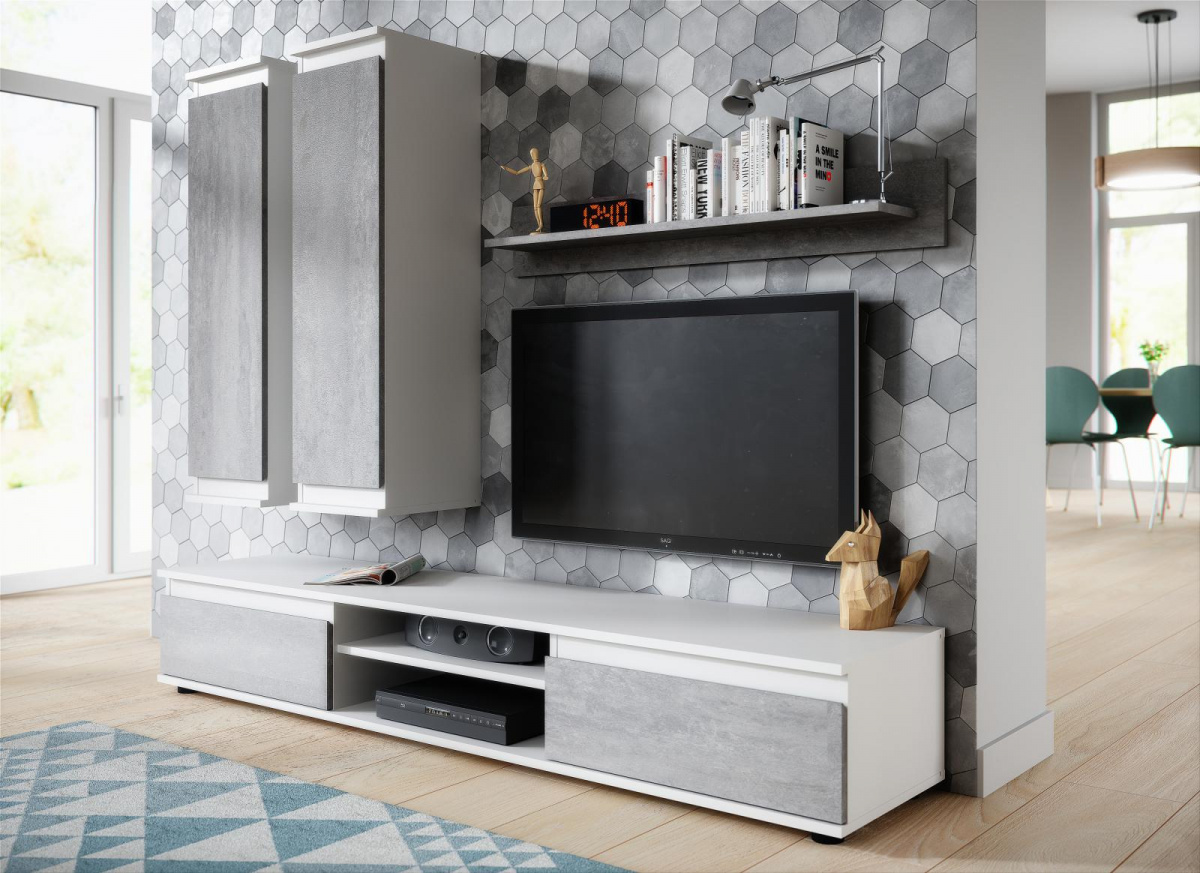 Obývací stěna Cher je vyrobena z lamina bílé barvy v kombinaci s dekorem beton. Kombinace těchto dekorů působí čistě a jemně. Skvěle zapadá do velmi oblíbeného skandinávského stylu a díky svým rozměrům je vhodná i do malometrážních bytů. Stěna se skládá ze dvou závěsných skříněk, police a TV stolku. Skříňky i stolek nabízí dostatek úložného prostoru. Ke stěně doporučujeme dokoupit konferenční stolek Cher ve stejném dekoru. Všechny díly jsou dodávány v demontu a součástí je montážní návod, včetně všech spojovacích prvků. Vyobrazené doplňky a dekorace nejsou v ceně.