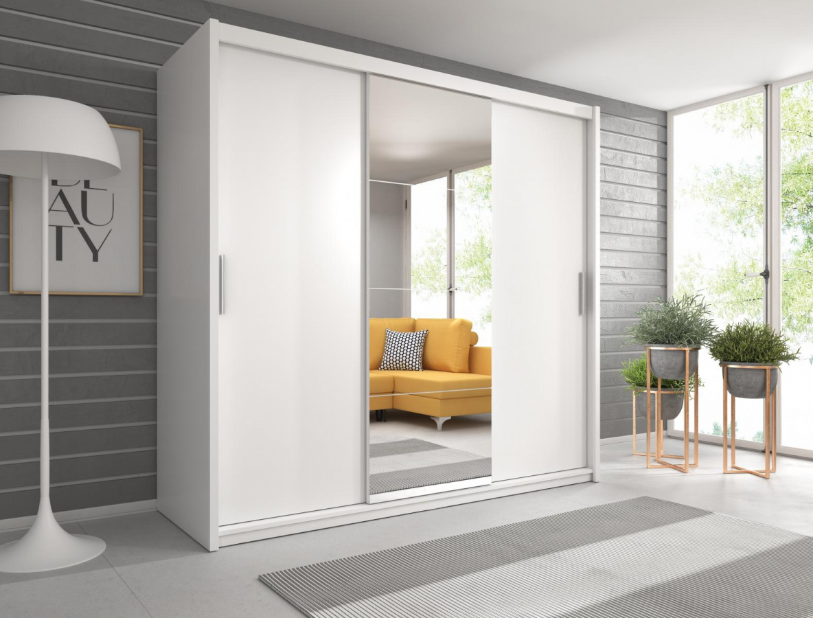 Šatní skříň Niobe je vyrobena z lamina, které je odolné a snadné na údržbu. Má posuvné dveře, které šetří prostor a na dveřích skříně je zrcadlo, které místnost opticky zvětší a prosvětlí. Díky svému vnitřnímu uspořádání (vyobrazeno v doplňkových fotografiích) nabízí skříň dostatek úložného prostoru. Ve skříni jsou mj. 2 zásuvky na drobné prádlo. Skříň nabízíme ve třech dekorech a také o rozměru 180 cm. Skříň je dodávána v demontu. Součástí balení je montážní návod včetně všech potřebných spojovacích prvků. Vyobrazené doplňky a dekorace nejsou v ceně.