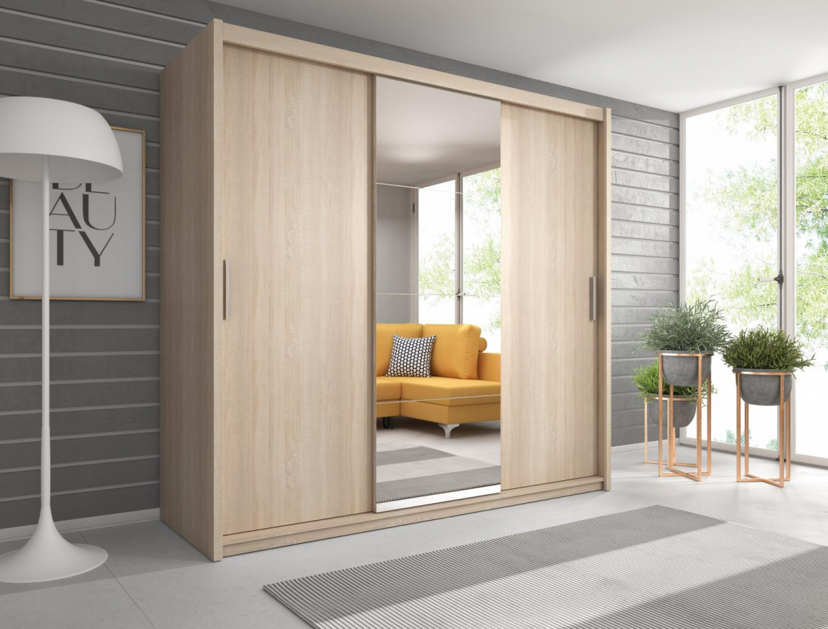 Šatní skříň Niobe je vyrobena z lamina, které je odolné a snadné na údržbu. Má posuvné dveře, které šetří prostor a na dveřích skříně je zrcadlo, které místnost opticky zvětší a prosvětlí. Díky svému vnitřnímu uspořádání (vyobrazeno v doplňkových fotografiích) nabízí skříň dostatek úložného prostoru. Ve skříni jsou mj. 2 zásuvky na drobné prádlo. Skříň nabízíme ve třech dekorech a také o rozměru 180 cm. Skříň je dodávána v demontu. Součástí balení je montážní návod včetně všech potřebných spojovacích prvků. Vyobrazené doplňky a dekorace nejsou v ceně.