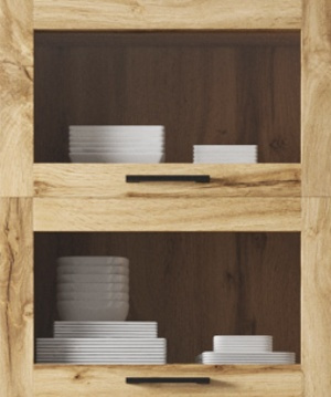 Vrchní kuchyňská skříňka 08/G60W je vyrobena z lamina 16 mm (korpus) a MDF 22 mm (dvířka) v dekoru dub wotan v kombinaci se sklem. Vyberte si z naší široké nabídky skříněk a vytvořte si kuchyň dle vlastních představ. V doplňkových fotografiích najdete pro inspiraci fotku kuchyně, která je z těchto skříněk sestavena. Skříňka je dodávaná v demontu. Součástí je montážní plánek včetně všech potřebných spojovacích materiálů.