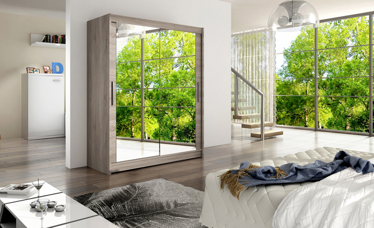 Jednoduchý a zárověň elegantní design skříně osloví i náročné zákazníky. Eleganci podtrhují dlouhé stříbrné úchyty a velká zrcadla, která jsou nalepena na dveřích skříně. Je vyrobena z lamina o síle 16 mm a hrany jsou ukončeny ABS lištou. Vodící lišty jsou vyrobeny z odolného hliníku a splňují požadavky pro každodenní užívání. Díky svému uspořádání poskytuje dostatek úložného prostoru. Skvěle se hodí do ložnice, předsíně, dětského, nebo studentského pokoje. Skříň je dodávána v demontu a součástí je montážní plánek včetně všech potřebných spojovacích materiálů. Vyobrazené dekorace nejsou v ceně.