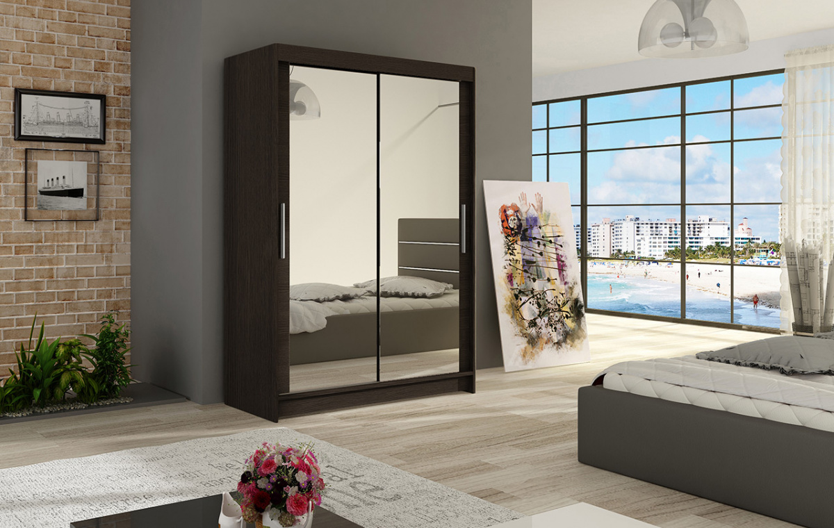 Moderní a elegantní design skříně osloví i náročné zákazníky. Eleganci podtrhují dlouhé stříbrné úchyty a zrcadla na dveřích skříně. Je vyrobena z lamina o síle 16 mm a hrany jsou ukončeny ABS lištou. Vodící lišty jsou vyrobeny z odolného hliníku a splňují požadavky pro každodenní užívání. Díky svému uspořádání poskytuje dostatek úložného prostoru. Skvěle se hodí do ložnice, předsíně, dětského, nebo studentského pokoje. Skříň je dodávána v demontu a součástí je montážní plánek včetně všech potřebných spojovacích materiálů. Vyobrazené dekorace nejsou v ceně.