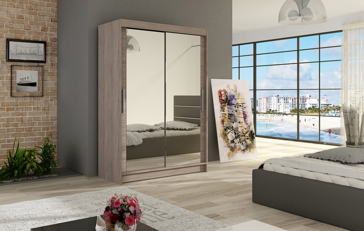 Moderní a elegantní design skříně osloví i náročné zákazníky. Eleganci podtrhují dlouhé stříbrné úchyty a zrcadla na dveřích skříně. Je vyrobena z lamina o síle 16 mm a hrany jsou ukončeny ABS lištou. Vodící lišty jsou vyrobeny z odolného hliníku a splňují požadavky pro každodenní užívání. Díky svému uspořádání poskytuje dostatek úložného prostoru. Skvěle se hodí do ložnice, předsíně, dětského, nebo studentského pokoje. Skříň je dodávána v demontu a součástí je montážní plánek včetně všech potřebných spojovacích materiálů. Vyobrazené dekorace nejsou v ceně.