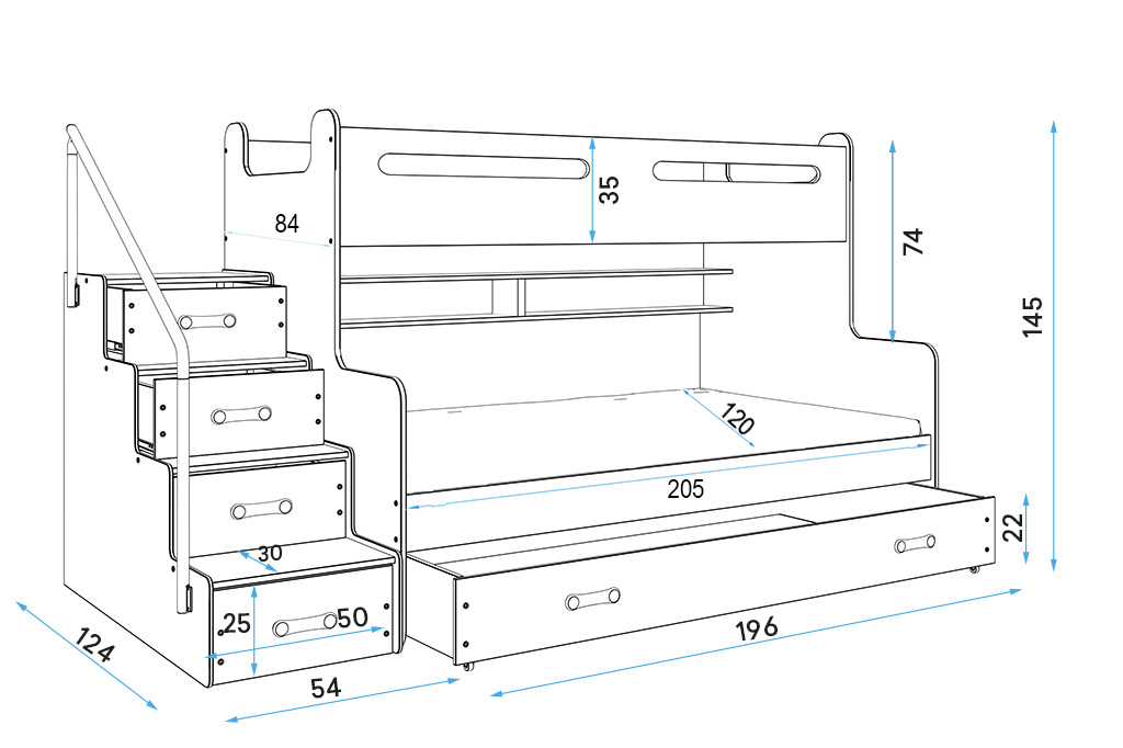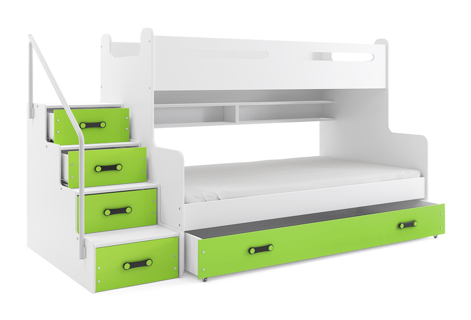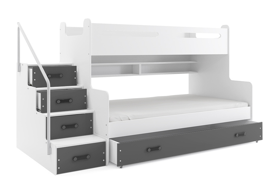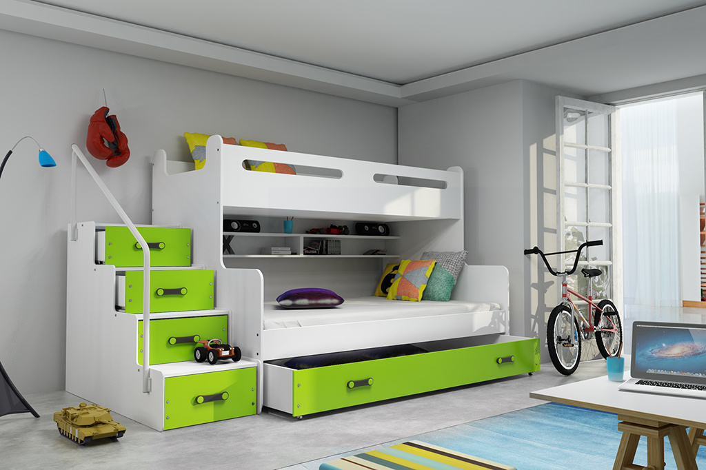 Dětská patrová postel Maty je určena pro ty, kteří pro své děti hledají funkčnost, moderní design a kvalitu. Její stabilní konstrukce, zaoblené hrany a zábrana na horní posteli, zajišťují bezpečnost a pohodlí dítěte. Postel nabízí prostor pro spaní až pro 3 děti a také spoustu úložných prostorů, které jsou v dětském pokoji nepostradatelné. Úložný prostor se skrývá ve spodní výsuvné části a také ve schůdkách, které vedou na vrchní část postele. Díky tomuto netradičnímu řešení, jsou schůdky dostatečně velké a bezpečné. Pro větší bezpečí Vašich dětí je na schůdkách umístěno zábradlí a vrchní postel má zvýšenou bočnici, která slouží jako zábrana. Součástí postele jsou 2 rošty a 2 pěnové matrace, plocha pro spaní je 1x 80x200 cm a 1x 120x200 cm. Postel nabízíme v několika barevných provedeních. Doporučená nosnost horního lůžka 70 kg, spodního lůžka 70 kg. Postel je dodávaná v demontu. Součástí balení je montážní návod včetně všech spojovacích prvků. Vyobrazené doplňky a dekorace nejsou v ceně. Zobrazení barev na fotografii se může od skutečnosti nepatrně lišit.
