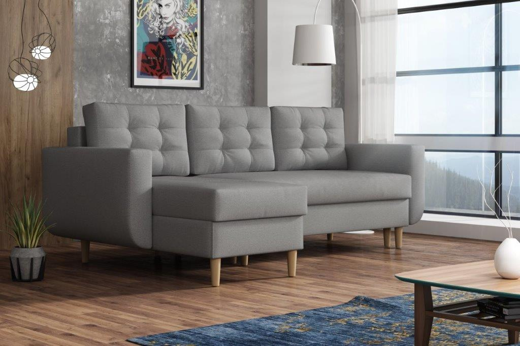 Sedací souprava Edita je krásným designovým RETRO kouskem, který výborně zapadne do moderního i klasického interiéru. Retro design podtrhují dřevěné nohy a vtahy na opěrných polštářích. Její velkou předností je pohodlí, praktičnost a univerzální použití. Tzn. že si ji můžete podle potřeby sestavit jako levou nebo pravou, což je výhoda při zařizování obývacího pokoje. Nemusíte přemýšlet do jakého rohu postavíte sedací soupravu, jednoduše ji podle potřeby přizpůsobíte. Sedací souprava je rozkládací a může tak sloužit k občasnému přespání Vaší návštěvy. Samozřejmostí je i praktický úložný prostor, který je v obou částech sedačky a můžete ho využít např. na lůžkoviny. Sedací souprava je potažena látkou a nabízíme v několika trendy barvách. Výplň sedáků tvoří kombinace pružin bonell s kvalitní PUR pěnou, což zajišťuje velmi pohodlné sezení. Sedací souprava je vhodná i do menších pokojů. Vyobrazené doplňky a dekorace nejsou v ceně. Zobrazení barev produktu na fotograii se může nepatrně lišit od skutečnosti.