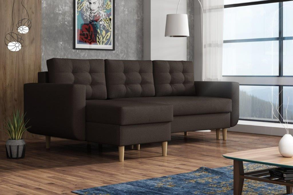 Sedací souprava Edita je krásným designovým RETRO kouskem, který výborně zapadne do moderního i klasického interiéru. Retro design podtrhují dřevěné nohy a vtahy na opěrných polštářích. Její velkou předností je pohodlí, praktičnost a univerzální použití. Tzn. že si ji můžete podle potřeby sestavit jako levou nebo pravou, což je výhoda při zařizování obývacího pokoje. Nemusíte přemýšlet do jakého rohu postavíte sedací soupravu, jednoduše ji podle potřeby přizpůsobíte. Sedací souprava je rozkládací a může tak sloužit k občasnému přespání Vaší návštěvy. Samozřejmostí je i praktický úložný prostor, který je v obou částech sedačky a můžete ho využít např. na lůžkoviny. Sedací souprava je potažena látkou a nabízíme v několika trendy barvách. Výplň sedáků tvoří kombinace pružin bonell s kvalitní PUR pěnou, což zajišťuje velmi pohodlné sezení. Sedací souprava je vhodná i do menších pokojů. Vyobrazené doplňky a dekorace nejsou v ceně. Zobrazení barev produktu na fotograii se může nepatrně lišit od skutečnosti.