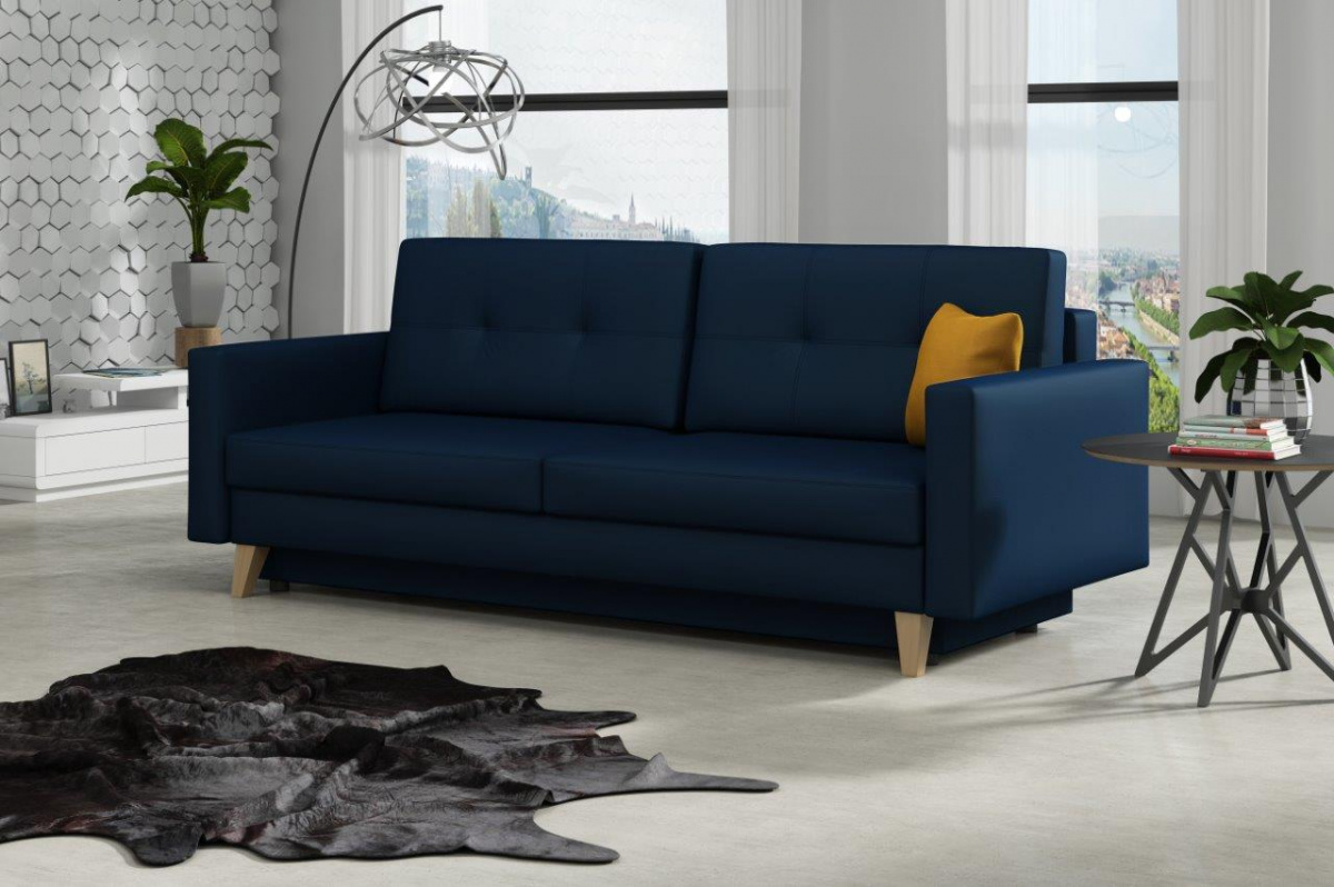 Pohovka Irma je krásná a elegantní pohovka, která výborně zapadne do každého interiéru. Pohovka je velmi pohodlná a praktická. Praktickou stránkou pohovky je možnost rozložení - jednoduchým rozložením pomocí automatu vznikne dostatečně prostorné lůžko občasnému přespání Vaší návštěvy a samozřejmostí je také nepostradatelný úložný prostor. Pohodlí při sezení zajišťuje výpň sedáku z vlnitých pružin v kombinaci s pružinami bonell a kvalitní PUR pěnou. Pohovka je celočalouněná, takže ji můžete umístit i do prostoru. Výborně se hodí do obývacího pokoje, do pracovny či pokoje pro hosty. Pohovku nabízíme v několika trendy barvách. V ceně pohovky je jeden dekorační polštářek. Ostatní vyobrazené dopňky a dekorace nejsou v ceně. Zobrazení barev produktu na fotograii se může nepatrně lišit od skutečnosti.