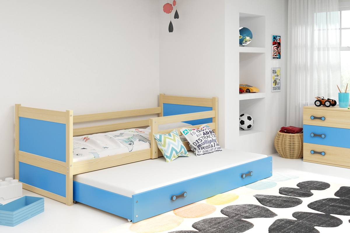 Dětská postel Riky II je určena pro ty, kteří pro své dítě hledají funkčnost, moderní design a kvalitu. Postel je vyrobena z borovicového dřeva v kombinaci s MDF deskou (barevné panely na bocích postele). Její stabilní konstrukce, zaoblené hrany a zábrana, která je v ceně postele, zajišťují bezpečnost a pohodlí dítěte. Zábranu si můžete podle potřeby umístit na pravou, nebo levou stranu postele. Součástí postele je také praktická přistýlka s matrací, kterou můžete využít pro druhé dítě, nebo když u Vašeho dítěte bude chtít přespat kamarád/ka. Obě části postele mají rošt a pěnovou matraci se snímatelným potahem. Plocha pro spaní je 90x200 cm (vrchní část) a 80x190 cm (přistýlka). Postel je dodávána v demontu a součástí je montážní plánek včetně všech potřebných spojovacích materiálů. Vyobrazené dekorace nejsou v ceně. Zobrazení barev na fotografii se může od skutečnosti nepatrně lišit.