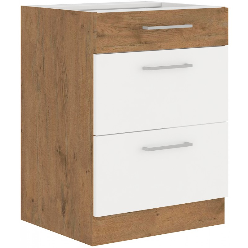 Spodní kuchyňská skříňka 60D-3S je vyrobena z lamina v dekoru dub lancelot v kombinaci s vysokým leskem. Cena skříňky je uvedena BEZ pracovní desky. Desku je možno dokoupit zvlášť podle rozměru skříňky a můžete si vybrat ze tří dekorů - Granit, Nubian a dub Lancelot. Prohlédněte si nabídku všech skříněk a vytvořte si kuchyň dle vlastních představ. Může být rohová, rovná, krátká i dlouhá. Fantazii se meze nekladou. V doplňkových fotografiích najdete pro inspiraci fotky kuchyní, které jsou z těchto skříněk sestaveny. Skříňka je dodávaná v demontu. Součástí je montážní plánek včetně všech potřebných spojovacích materiálů.