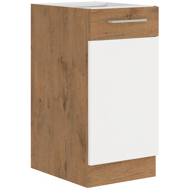 Spodní kuchyňská skříňka 40D-1F je vyrobena z lamina v dekoru dub lancelot v kombinaci s vysokým leskem. Cena skříňky je uvedena BEZ pracovní desky. Desku je možno dokoupit zvlášť podle rozměru skříňky a můžete si vybrat ze tří dekorů - Granit, Nubian a dub Lancelot. Prohlédněte si nabídku všech skříněk a vytvořte si kuchyň dle vlastních představ. Může být rohová, rovná, krátká i dlouhá. Fantazii se meze nekladou. V doplňkových fotografiích najdete pro inspiraci fotky kuchyní, které jsou z těchto skříněk sestaveny. Skříňka je dodávaná v demontu. Součástí je montážní plánek včetně všech potřebných spojovacích materiálů.