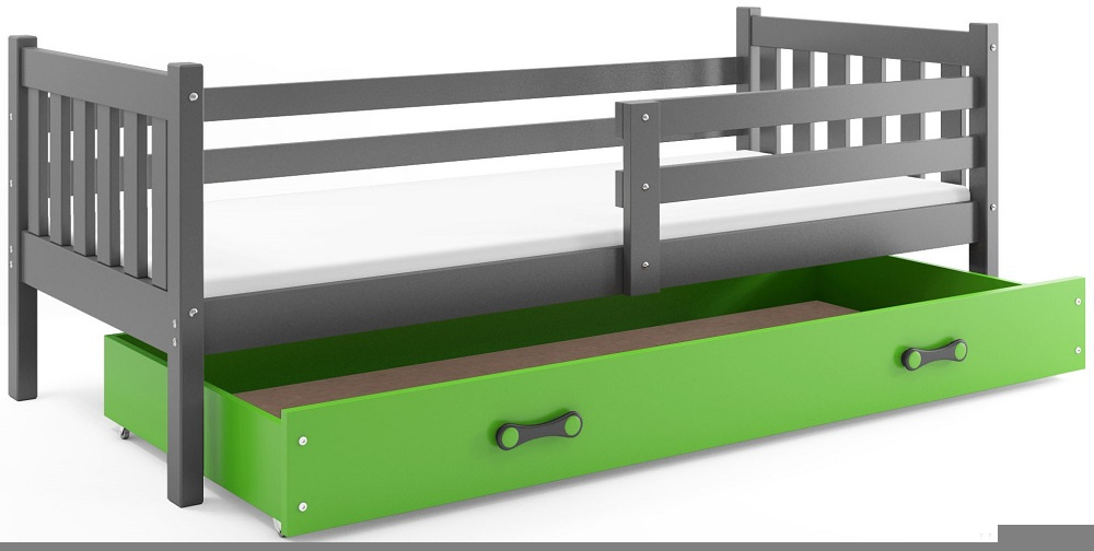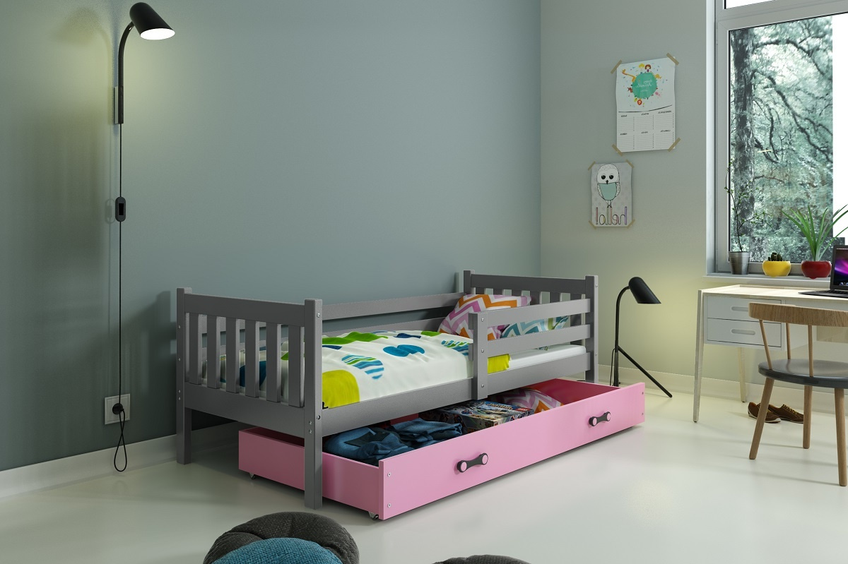 Dětská postel Carlo vyniká funkčností, moderním designem a kvalitou. Postel je vyrobena z borovicového dřeva, které je lakováno vodou ředitelným lakem, který je vhodný na dětský nábytek a vyhovuje normám o nezávadnosti. V ceně postele je zábrana, která zajistí bezpečný a klidný spánek Vašeho dítěte. Zábranu si můžete podle potřeby umístit na pravou, nebo levou stranu postele. Součástí postele je také praktický úložný prostor na kolečkách, který můžete využít např. na hračky nebo lůžkoviny, rošt a pěnová matrace se snímatelným potahem. Plocha pro spaní je 80x190 cm. Postel je dodávána v demontu a součástí je montážní plánek včetně všech potřebných spojovacích materiálů. Postel nabízíme ve dvou barevných provedeních. Vyobrazené doplňky a dekorace nejsou v ceně. Zobrazení barev na fotografii se může od skutečnosti nepatrně lišit.
