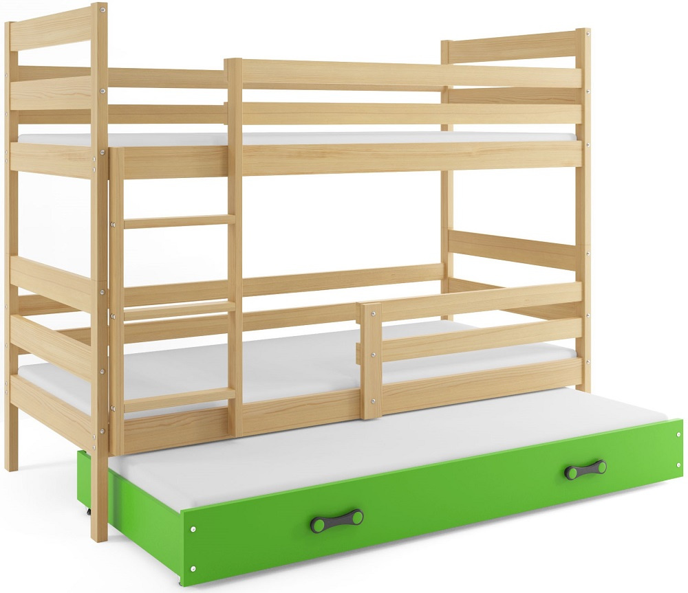 Dětská patrová postel Norbert je určena pro ty, kteří pro své dítě hledají funkčnost, moderní design a kvalitu. Postel je vyrobena z kvalitního borovicového dřeva. Její stabilní konstrukce, zaoblené hrany a zábrana na horní i dolní posteli, zajišťují bezpečnost a pohodlí dítěte. Žebřík si můžete podle potřeby umístit na pravou, nebo levou stranu postele. Když děti patrová postel omrzí, je možno palandu rozložit na dvě samostatné postele. Součástí postele je také praktická přistýlka s matrací, kterou můžete využít pro další dítě, nebo když u Vašeho dítěte bude chtít přespat kamarád/ka. Všechny části postele mají rošt a pěnovou matraci v ceně. Plocha pro spaní je 90x200 cm (vrchní a spodní část) a 80x190 cm (přistýlka). Postel je dodávána v demontu a součástí je montážní plánek včetně všech potřebných spojovacích materiálů. Vyobrazené dekorace nejsou v ceně. Zobrazení barev na fotografii se může od skutečnosti nepatrně lišit.