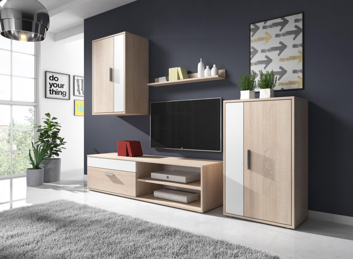 Obývací stěna Togo je vyrobena z lamina, které je odolné proti poškrábání a je velmi snadné na údržbu. Díky svým rozměrům je vhodná i pro ty, kteří obývají malometrážní byty a garsonky. Televizní stolek má v levé části výklopná dvířka, v pravé části je police. Závěsná skříňka i komoda jsou uvnitř vybaveny policí. Cena je uvedena za komplet vyobrazený na fotografii, bez doplňků a dekorací. Obývací stěna Togo je dodávaná v demontu. Součástí balení je montážní návoz včetně všech potřebných spojovacích prvků.