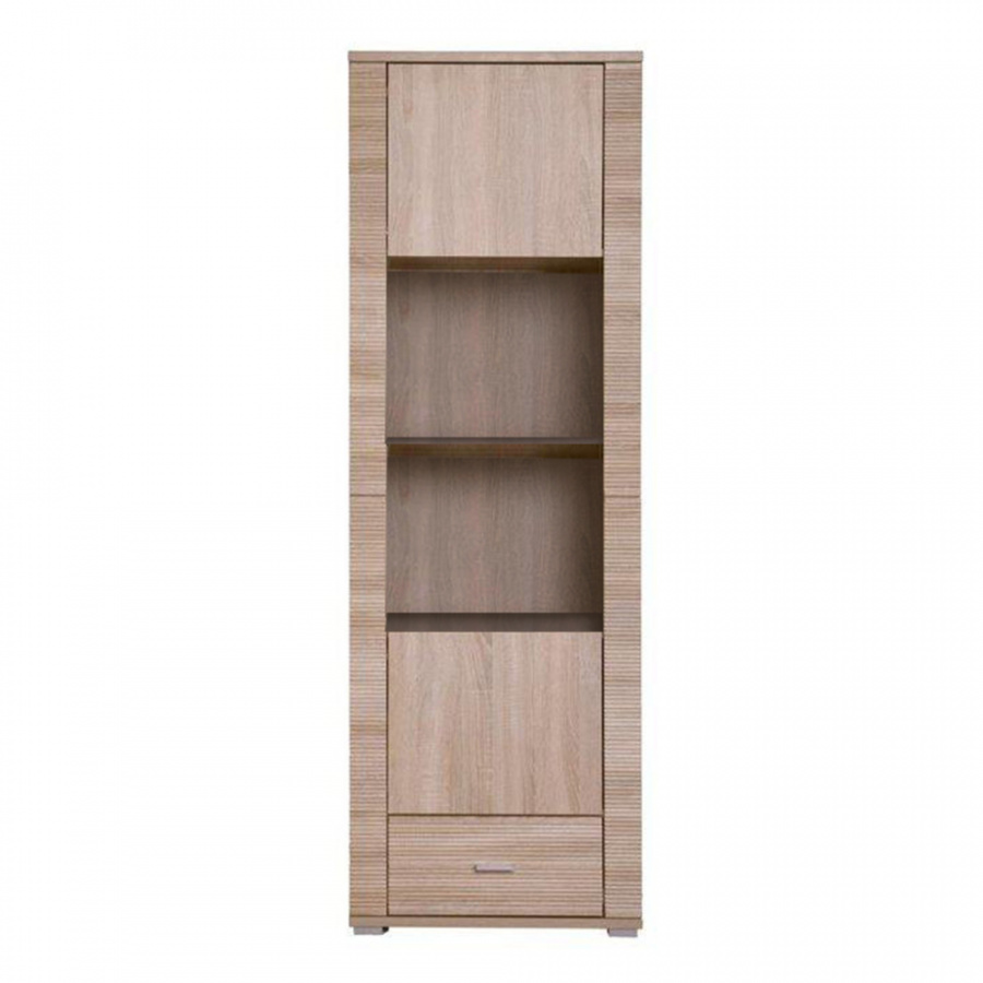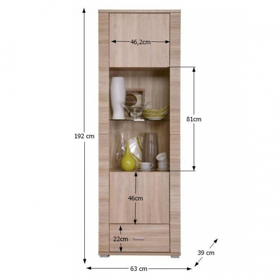 Vitrína typ 05, vhodná na zařízení obývacích pokojů, ložnic i pracoven, materiál: DTD laminovaná. Hrany jednotlivých komponentů jsou ukončeny vroubkovanou lištou. Barevné provedení: dub sonoma. Rozměry (ŠxVxH): 63x192x39 cm. Tloušťka materiálu korpus: 16 mm