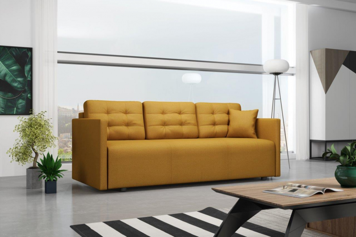 Pohovka Babeta je vyrobena v elegantním designu s nádechem retro stylu. Její velkou předností je pohodlí a praktičnost. Výplň sedáku tvoří pružiny bonell s kvalitní PUR pěnou. Pohodlí při sezení poskytují polštáře, které si můžete přizpůsobit tak, aby se Vám pohodlně sedělo a odpočívalo. Praktickou stánkou pohovky je možnost rozložení. Jednoduchým rozložením pomocí automatu získáte dostatečně velké lůžko pro příležitostné přespání Vaší návštěvy. Pohovka má také nezbytný úložný prostor, který využijete např. na lůžkoviny. Pohovka je celočalouněná, takže ji můžete umístit i do prostoru. Výborně se hodí do obývacího pokoje, do pracovny či pokoje pro hosty. Pohovku nabízíme v několika trendy barvách. Vyobrazené dopňky a dekorace nejsou v ceně. Zobrazení barev na fotografii se může od skutečnosti lišit.