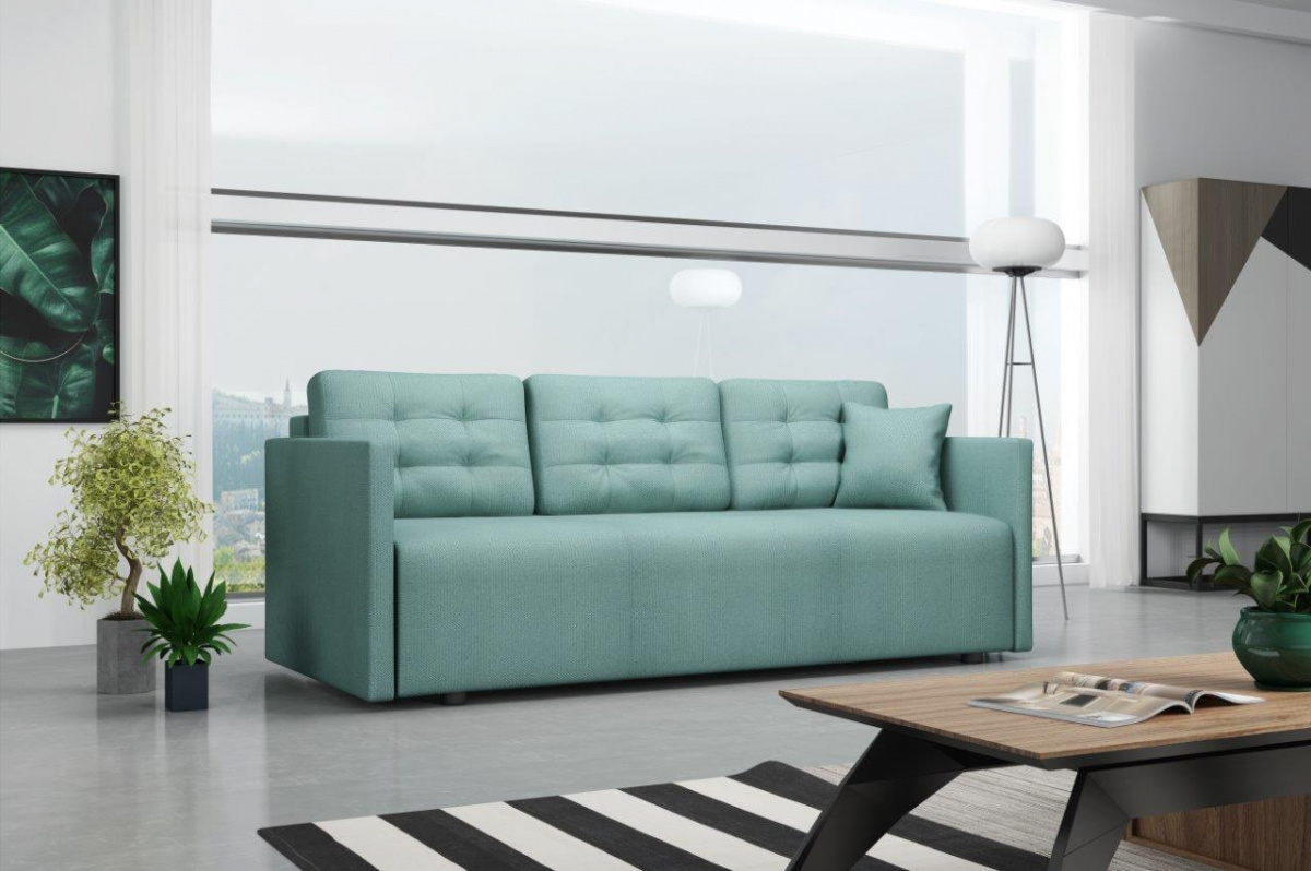Pohovka Babeta je vyrobena v elegantním designu s nádechem retro stylu. Její velkou předností je pohodlí a praktičnost. Výplň sedáku tvoří pružiny bonell s kvalitní PUR pěnou. Pohodlí při sezení poskytují polštáře, které si můžete přizpůsobit tak, aby se Vám pohodlně sedělo a odpočívalo. Praktickou stánkou pohovky je možnost rozložení. Jednoduchým rozložením pomocí automatu získáte dostatečně velké lůžko pro příležitostné přespání Vaší návštěvy. Pohovka má také nezbytný úložný prostor, který využijete např. na lůžkoviny. Pohovka je celočalouněná, takže ji můžete umístit i do prostoru. Výborně se hodí do obývacího pokoje, do pracovny či pokoje pro hosty. Pohovku nabízíme v několika trendy barvách. Vyobrazené dopňky a dekorace nejsou v ceně. Zobrazení barev na fotografii se může od skutečnosti lišit.