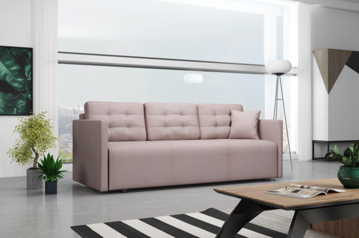 Pohovka Babeta je vyrobena v elegantním designu s nádechem retro stylu. Její velkou předností je pohodlí a praktičnost. Výplň sedáku tvoří pružiny bonell s kvalitní PUR pěnou. Pohodlí při sezení poskytují polštáře, které si můžete přizpůsobit tak, aby se Vám pohodlně sedělo a odpočívalo. Praktickou stánkou pohovky je možnost rozložení. Jednoduchým rozložením pomocí automatu získáte dostatečně velké lůžko pro příležitostné přespání Vaší návštěvy. Pohovka má také nezbytný úložný prostor, který využijete např. na lůžkoviny. Pohovka je celočalouněná, takže ji můžete umístit i do prostoru. Výborně se hodí do obývacího pokoje, do pracovny či pokoje pro hosty. Pohovku nabízíme v několika trendy barvách. Vyobrazené dopňky a dekorace nejsou v ceně. Zobrazení barev na fotografii se může od skutečnosti lišit.
