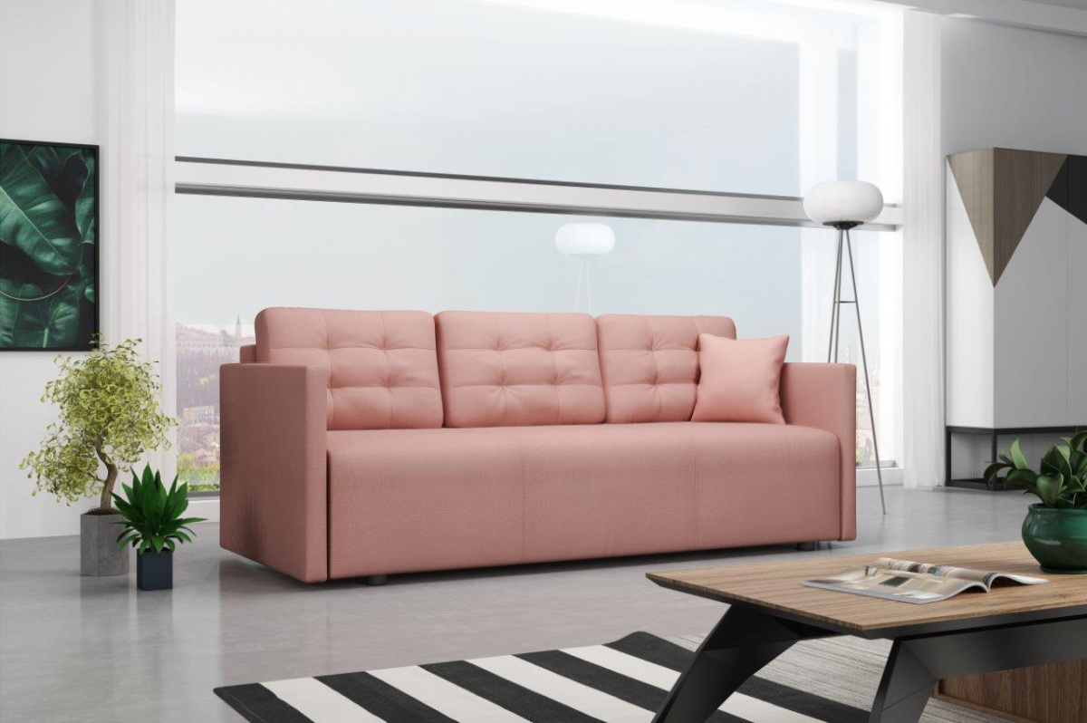 Pohovka Babeta je vyrobena v elegantním designu s nádechem retro stylu. Její velkou předností je pohodlí a praktičnost. Výplň sedáku tvoří pružiny bonell s kvalitní PUR pěnou. Pohodlí při sezení poskytují polštáře, které si můžete přizpůsobit tak, aby se Vám pohodlně sedělo a odpočívalo. Praktickou stánkou pohovky je možnost rozložení. Jednoduchým rozložením pomocí automatu získáte dostatečně velké lůžko pro příležitostné přespání Vaší návštěvy. Pohovka má také nezbytný úložný prostor, který využijete např. na lůžkoviny. Pohovka je celočalouněná, takže ji můžete umístit i do prostoru. Výborně se hodí do obývacího pokoje, do pracovny či pokoje pro hosty. Pohovku nabízíme v několika trendy barvách. Vyobrazené dopňky a dekorace nejsou v ceně. Zobrazení barev na fotografii se může od skutečnosti lišit.