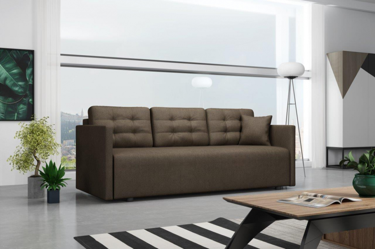 Pohovka Babeta je vyrobena v elegantním designu s nádechem retro stylu. Její velkou předností je pohodlí a praktičnost. Výplň sedáku tvoří pružiny bonell s kvalitní PUR pěnou. Pohodlí při sezení poskytují polštáře, které si můžete přizpůsobit tak, aby se Vám pohodlně sedělo a odpočívalo. Praktickou stánkou pohovky je možnost rozložení. Jednoduchým rozložením pomocí automatu získáte dostatečně velké lůžko pro příležitostné přespání Vaší návštěvy. Pohovka má také nezbytný úložný prostor, který využijete např. na lůžkoviny. Pohovka je celočalouněná, takže ji můžete umístit i do prostoru. Výborně se hodí do obývacího pokoje, do pracovny či pokoje pro hosty. Pohovku nabízíme v několika trendy barvách. Vyobrazené dopňky a dekorace nejsou v ceně. Zobrazení barev na fotografii se může od skutečnosti lišit.