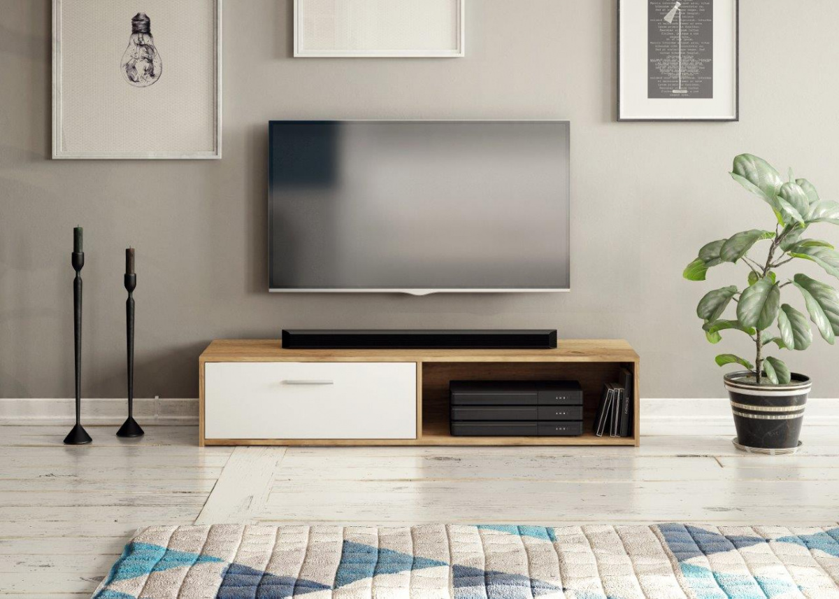 TV stolek Skip poskytuje dostatek prostoru nejen na televizi, ale i pro ostatní elektroniku, jako je např.domácí kino, herní konzole, audio technika atd...Stolek je vyrobený z lamina, které je odolné a lehce se udržuje. Jeho jednoduché rovné linie se skvěle hodí do každého interiéru. Stolek je vybaven dvěmi prostornými přihrádkami, z toho jedna má dvířka a také otvorem pro vedení kabelů. TV stolek Skip je dodávaný v demontu a součástí balení je montážní návod včetně všech potřebných spojovacích prvků. Stolek nabízíme ve čtyřech dekorech. Vyobrazené doplňky, dekorace a elektronika nejsou v ceně.