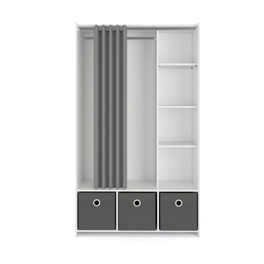 Šatní skříň Harmony má netypický a originální design. Je vyrobena z lamina, dveře jsou nahrazeny závěsem a místo zásuvek je skříň vybavena úložnými boxy v šedé barvě. Nabízí dostatek úložného prostoru a univerzální využití. Skvěle se hodí do studentských pokojů, kanceláří, pracoven dětských pokojů i předsíní. Skříň je dodávaná v demontu. Součástí balení je montážní plánek včetně všech spojovacích prvků. Vyobrazené doplňky a dekorace nejsou v ceně.