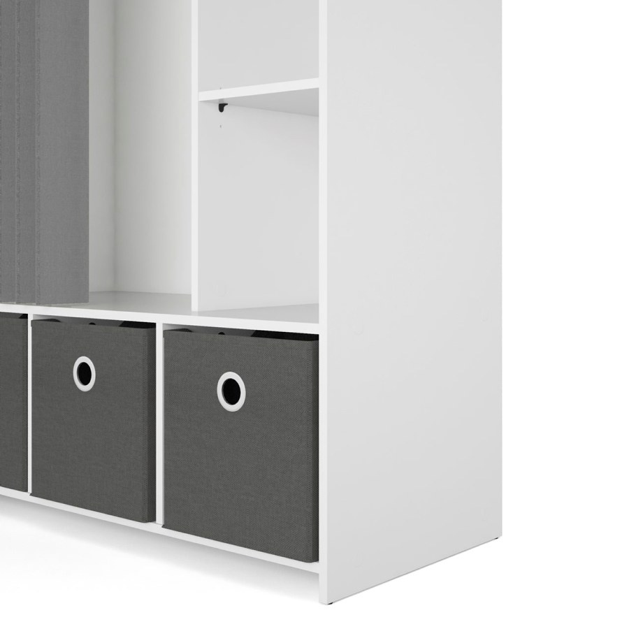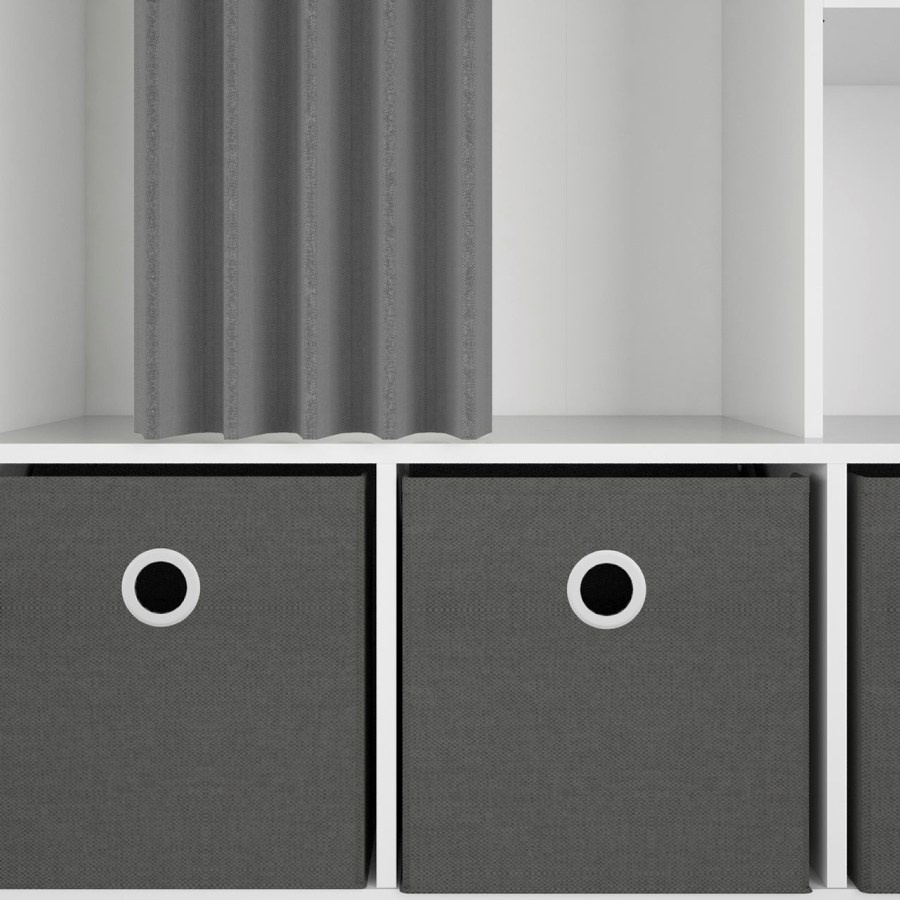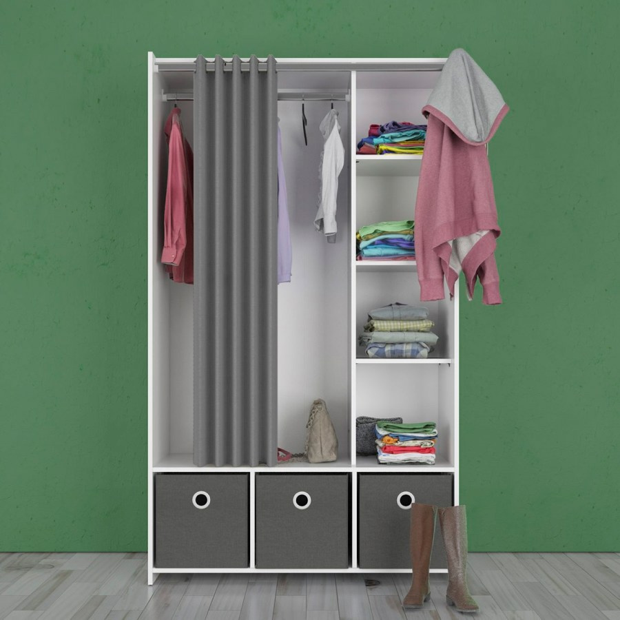 Šatní skříň Harmony má netypický a originální design. Je vyrobena z lamina, dveře jsou nahrazeny závěsem a místo zásuvek je skříň vybavena úložnými boxy v šedé barvě. Nabízí dostatek úložného prostoru a univerzální využití. Skvěle se hodí do studentských pokojů, kanceláří, pracoven dětských pokojů i předsíní. Skříň je dodávaná v demontu. Součástí balení je montážní plánek včetně všech spojovacích prvků. Vyobrazené doplňky a dekorace nejsou v ceně.