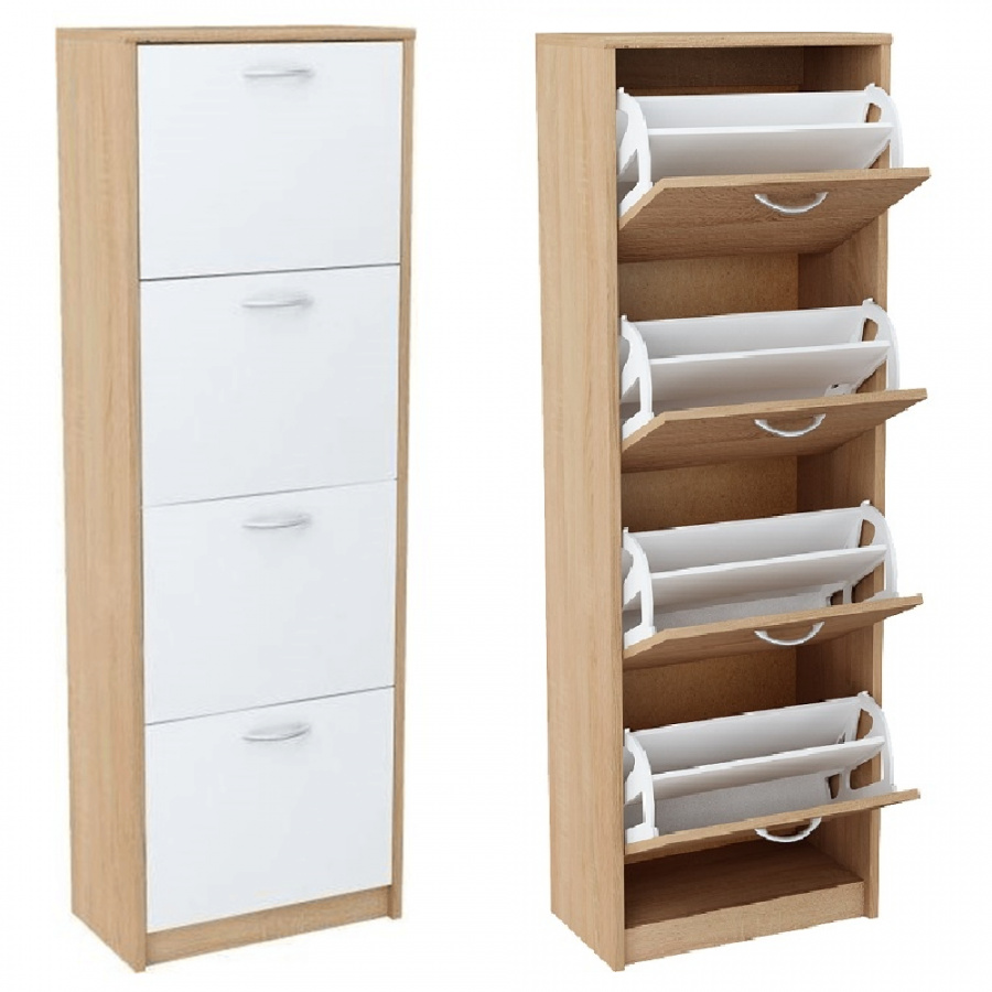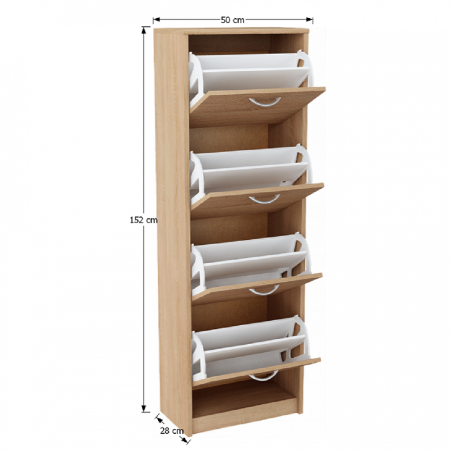 Čtyřřadý výklopný botník Materiál DTD laminovaná Provedení: dub sonoma / bílá Rozměry (ŠxHxV): 50x28x152 cm Tloušťka materiálu: 16 mm Dodávané v demontu.