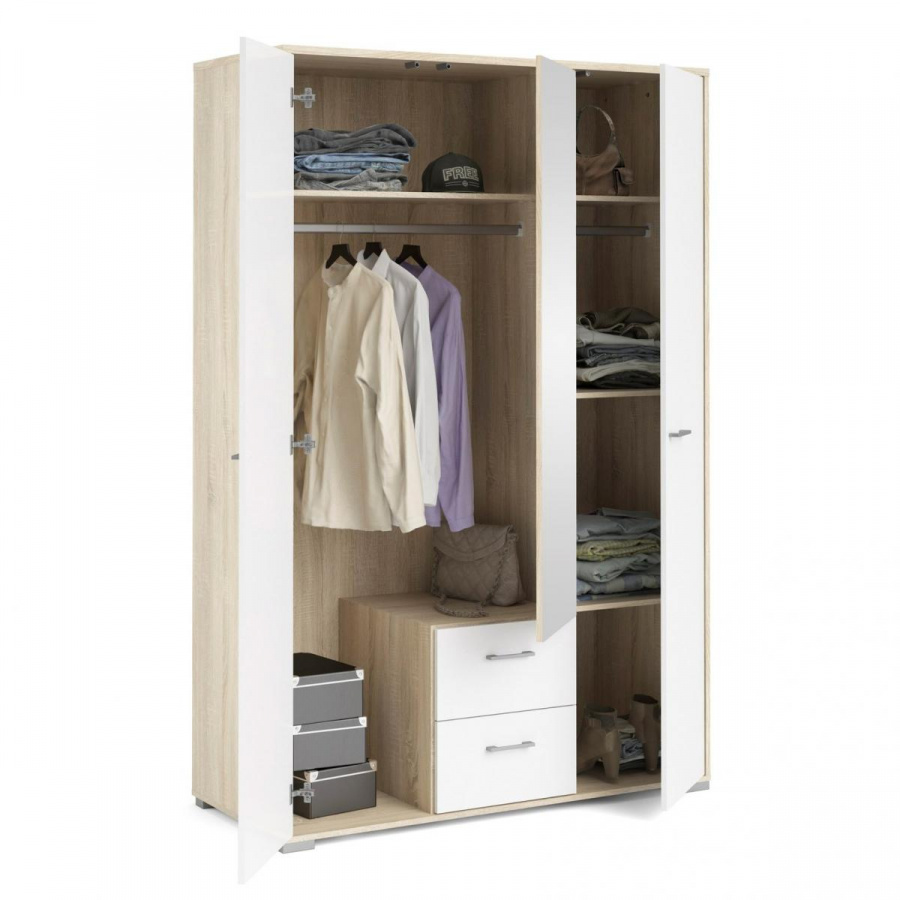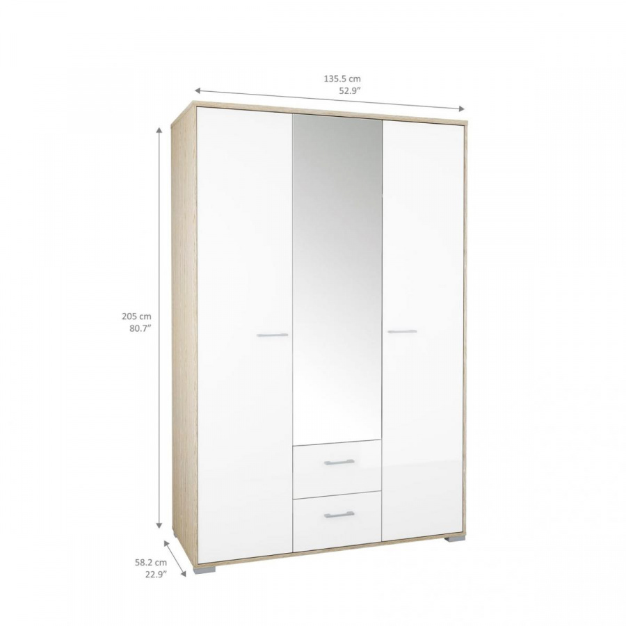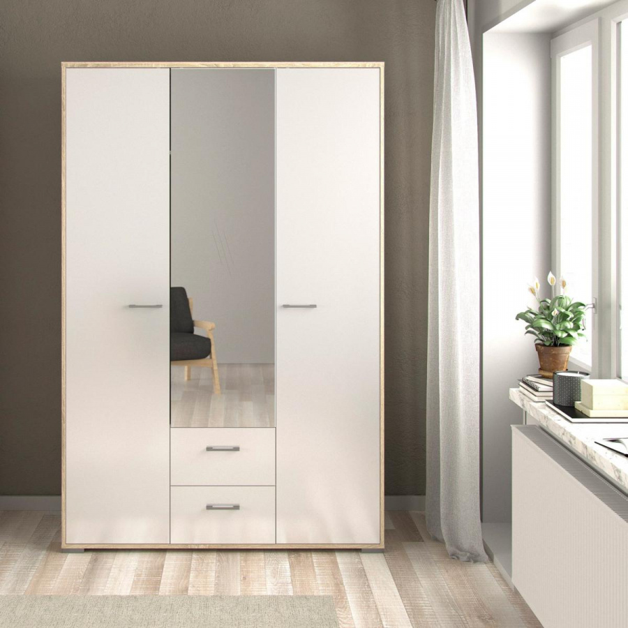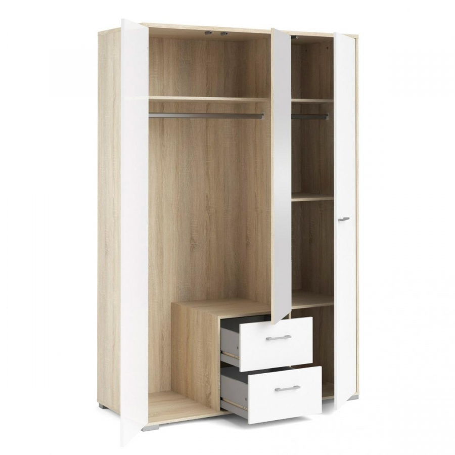 Šatní skříň Dante je vyrobená v jednoduchém a nadčasovém stylu, který se hodí do každého interiéru. Při výrobě je kladen důraz na ekologii, takže je vyráběna v souladu s ohledy na životní prostředí. Své uplatnění najde nejen v ložnici, ale také v dětském i studentském pokoji, nebo v předsíni. Praktické členění skříně, které je vyobrazeno v doplňkových fotografiích, poskytuje dostatek úložného prostoru a pomůže Vám tak udržet ve Vašich věcech přehled a pořádek. Při úpravě zevnějšku jistě oceníte zrcadlo, které je na dveřích skříně. Zrcadlo také místnost opticky zvětší a prosvětlí. Skříň je dodávaná v demontu. Součástí balení je montážní návod včetně všech spojovacích prvků.