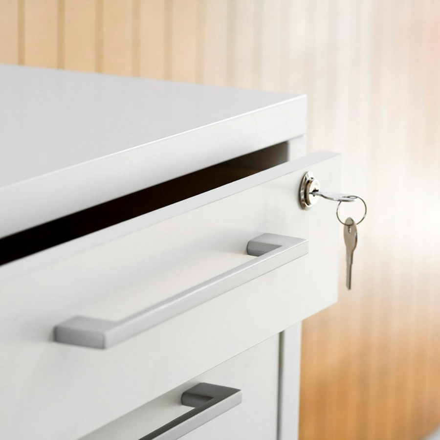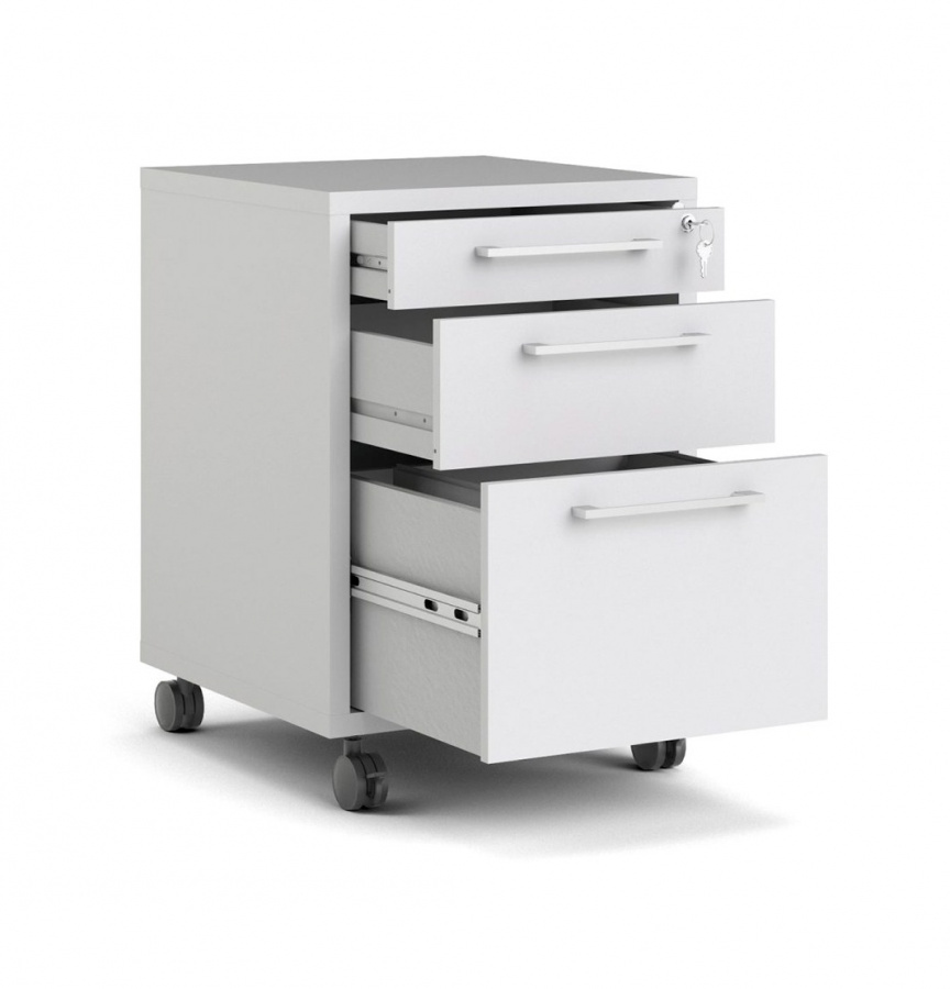 Kontejner Office na kolečkách slouží jako příruční úložný prostor u psacího stolu, který můžete využít na vše, co potřebujete mít vždy po ruce. Ať už to budou kancelářské potřeby nebo důležité listiny, vše bude mít své místo. Díky kolečkům můžete kontejer libovolně podle potřeby přemístit. Kolečka mají brzdy, takže kontejner po ustavení pevně stojí na svém místě. Kontejner je vyrobený z lamina, je opatřený zámkem a nabízíme ho v několika barevných dekorech. Je dodávaný v demontu. Součástí balení je montážní návod, včetně všech potřebných spojovacích prvků. Cena je uvedena za kontejner na kolečkách se zámkem.