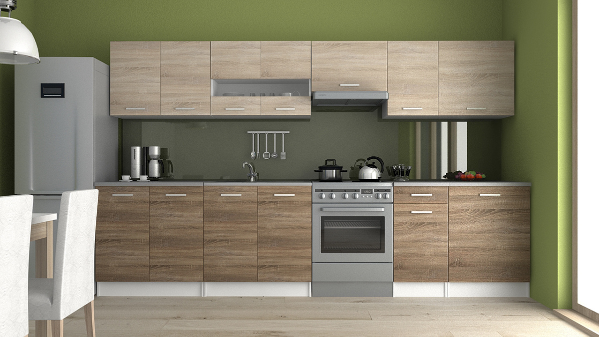 Kuchyňská linka Luigi je ideální volbou pro Vaši kuchyň. Je moderní a zároveň i praktická. Skříňky nabízejí dostatek úložného prostoru. Je vyrobená z lamina, které je odolné a snadné na údržbu. Díky svým rozměrům je vhodná i do malých kuchyní. Skříňky si můžete sestavit libovolně. Kuchyňská linka je dodávaná v demontu. Součástí balení je montážní plánek včetně všech potřebných spojovacích materiálů. Cena je uvedna za sestavu vyobrazenou na úvodní fotografii BEZ PRACOVNÍ DESKY. Kuchyň nabízíme v několika rozměrech i dekorech.Vyobrazené spotřebiče, dřez a dekorace nejsou v ceně.