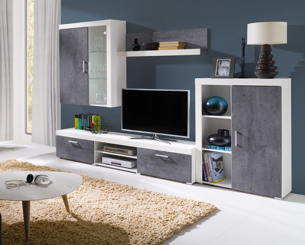 V ceně sestavy je TV stolek, závěsná vitrína, police a skříňka.