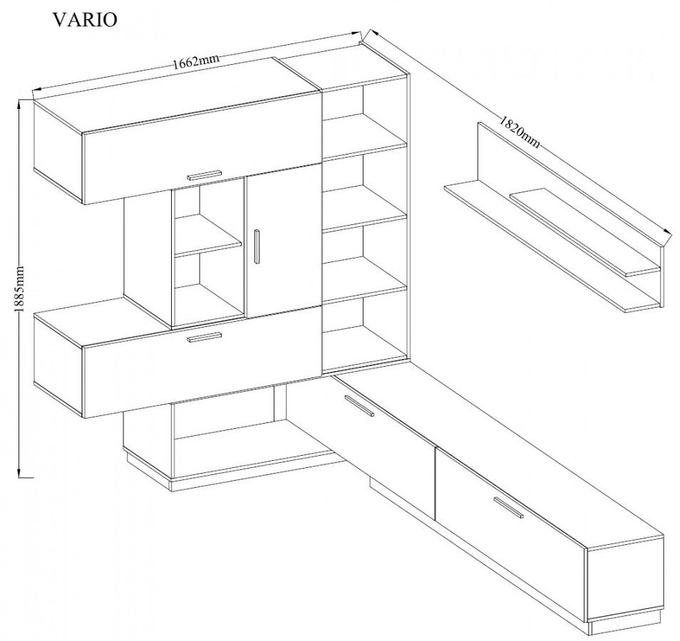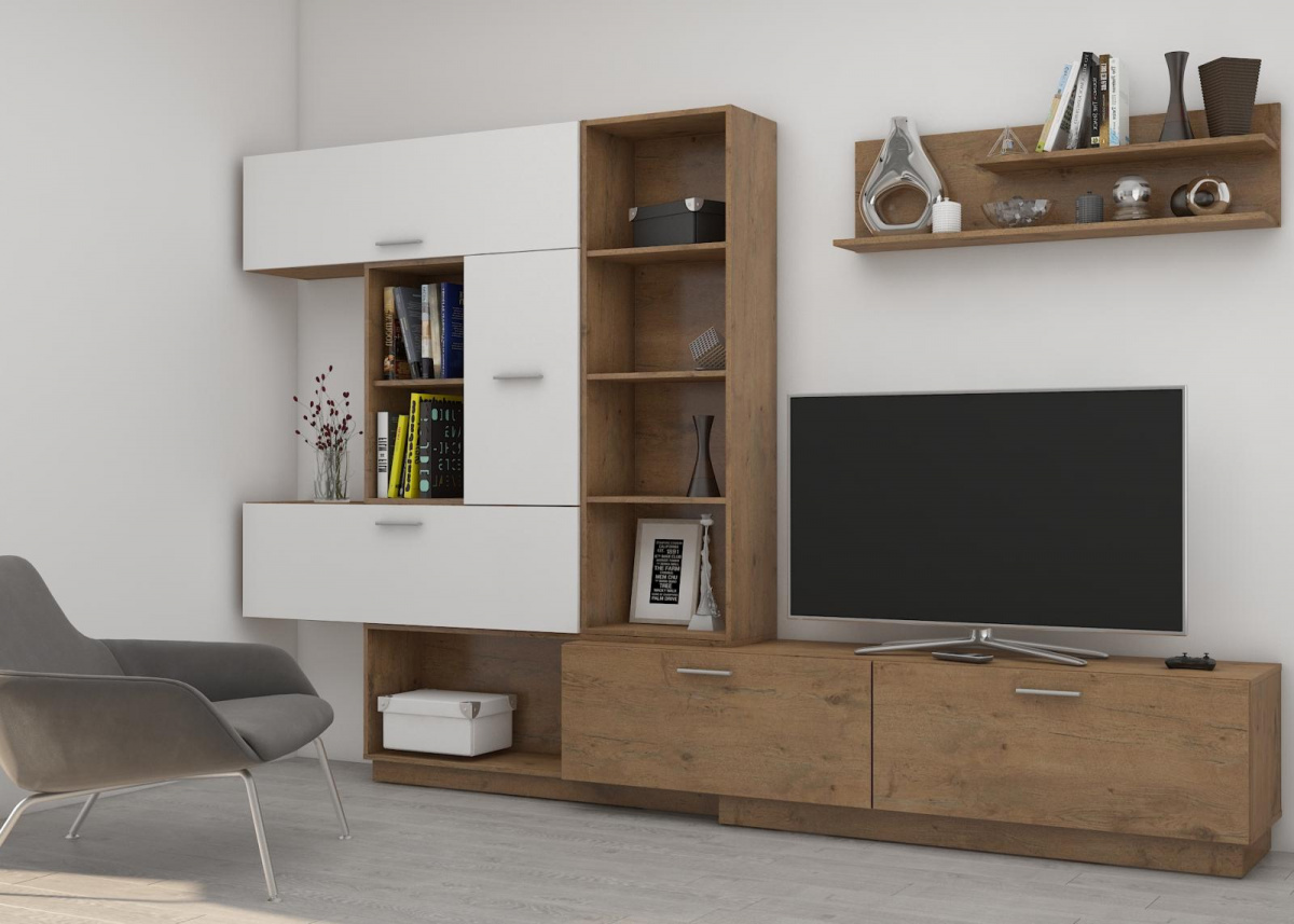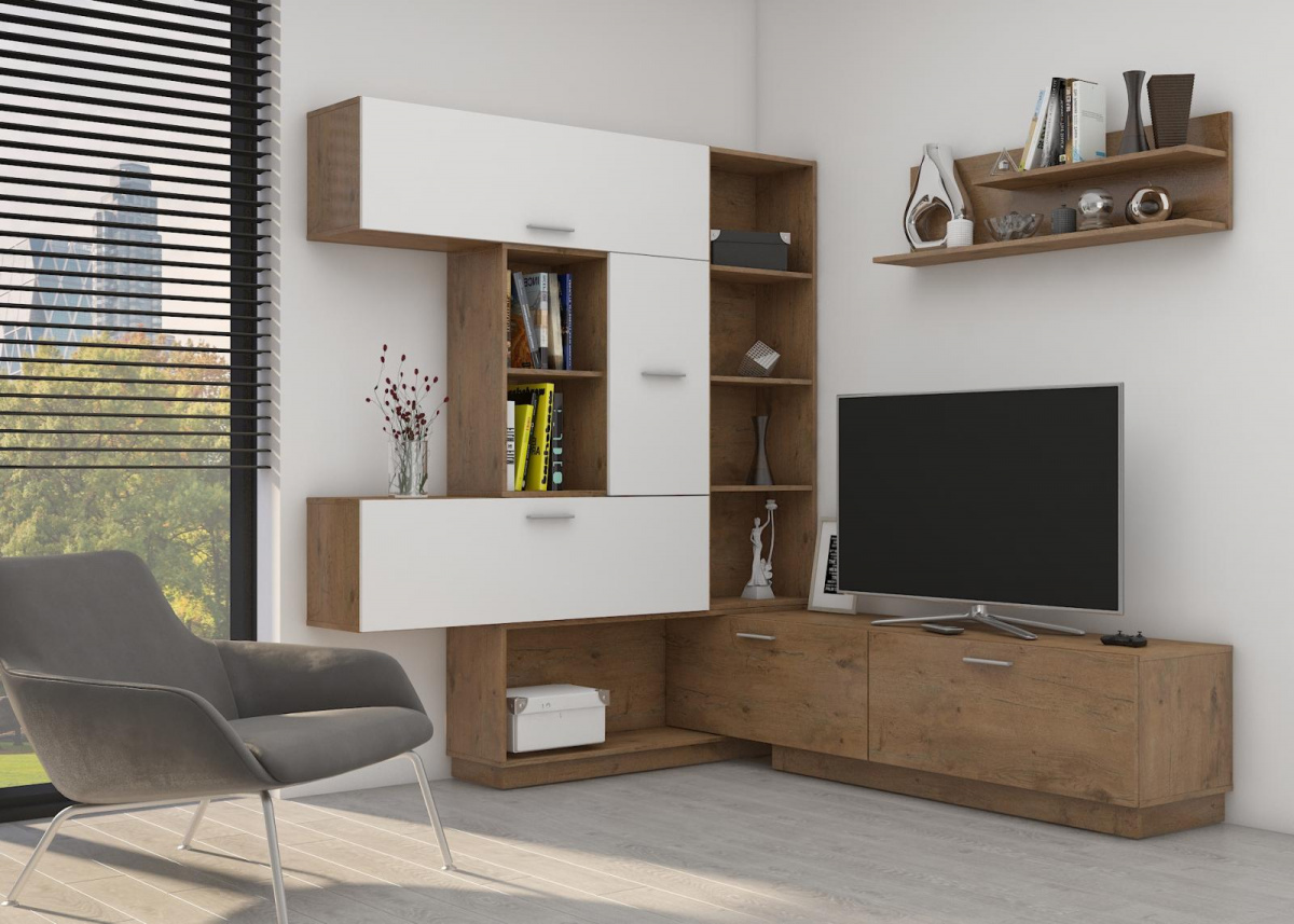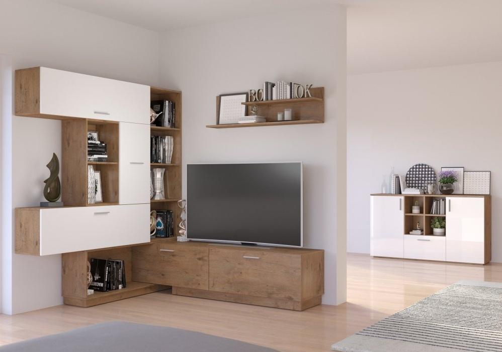 Moderní obývací stěna Corner, je vyrobená v jednoduchém designu, který se hodí do každého interiéru. Stěna je vyrobena z lamina v kombinaci dřevodekoru dub lancelot s bílým leskem. Obývací stěna Corner má 2 možnosti sestavení. Jedna možnost je, že si stěnu sestavíte v rohovém provedení - viz úvodní fotografie, druhá možnost je sestavení v rovné linii - viz.doplňková fotografie. K bytové stěně lze dokoupit komodu ve stejném dekoru. Všechny prvky této sestavy jsou dodávány v demontu. Součástí je montážní plánek včetně všech potřebných spojovacích materiálů. Vyobrazené dekorace nejsou v ceně.