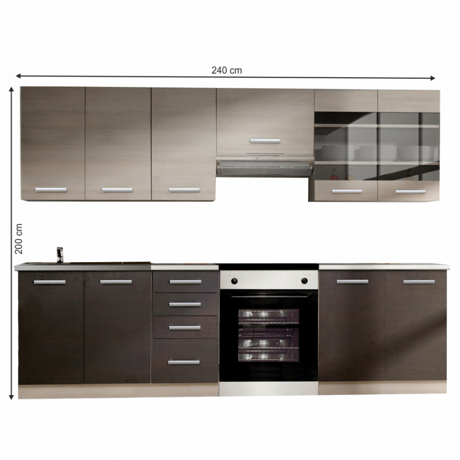 Šířka horních skříněk 2,4 metru, šířka spodních skříněk bez sporáku 1,8 metru