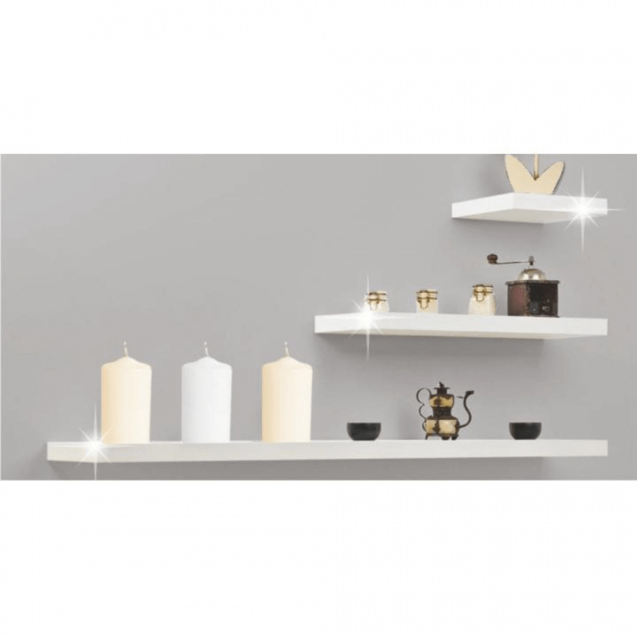 Police, která se stává součástí stěny díky skrytému nástěnnému kování. Materiál: MDF Provedení: bílý lesk Rozměry ŠxHxV: 120x25x5 cm. Nosnost police je 5-8 kg