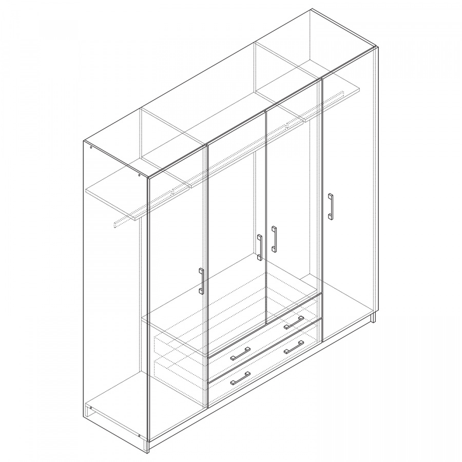 ve všech třech částech šatní tyč a police, ve střední části dole 2 zásuvky