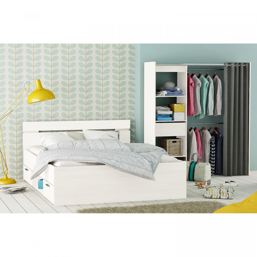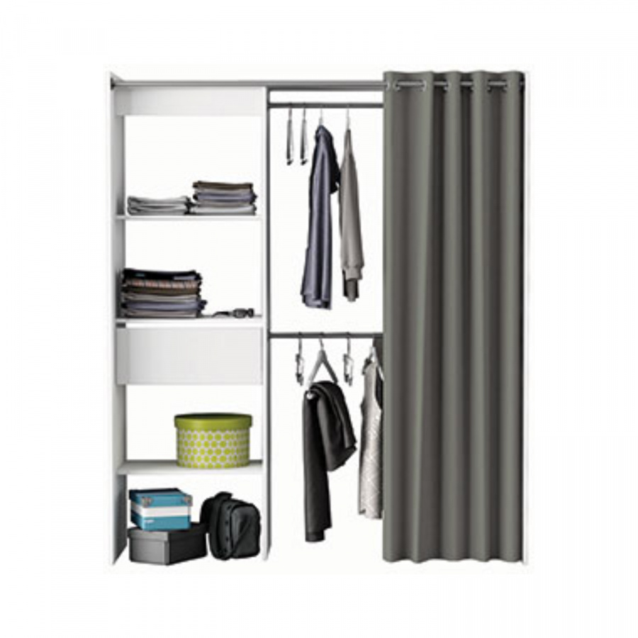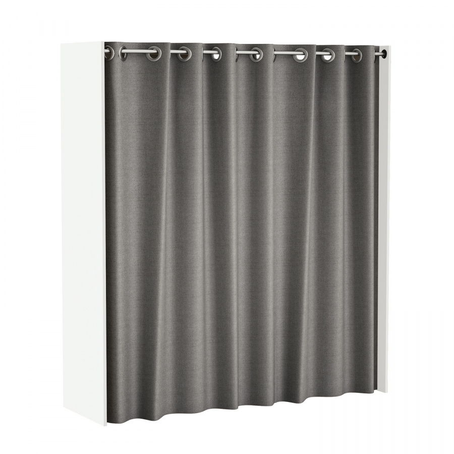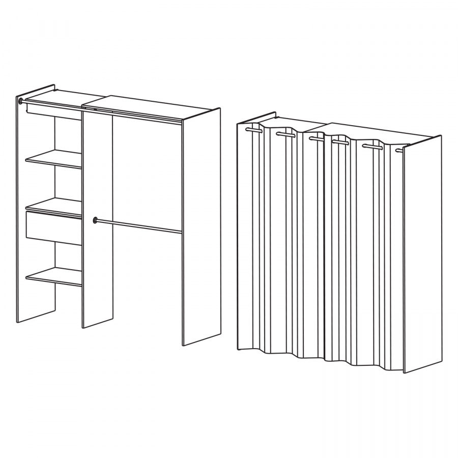 barevné provedení perleťově bílá, tmavě hnědý závěs, materiál 100% bavlna šatní skříň, sestavitelná v šířce 114 až 169 cm lišta na závěs o délce 165 cm, 3 police o rozměru (š/h) 57 × 40 cm 1 zásuvka s kovovými pojezdy, rozměr zásuvky (š/h/v) 52 × 31 × 11 cm 2 plastem potažené kovové šatní tyče o průměru 18 mm a délce 108 cm rozměr závěsu 203 × 190 cm, 12 otvorů pro zavěšení