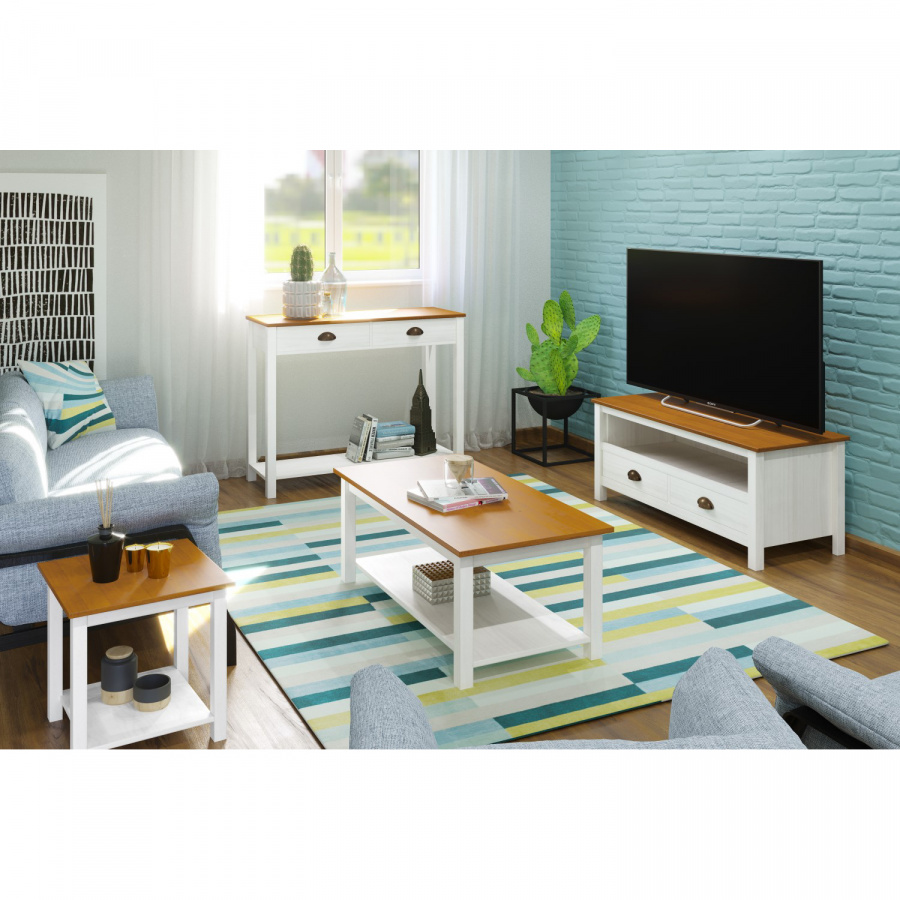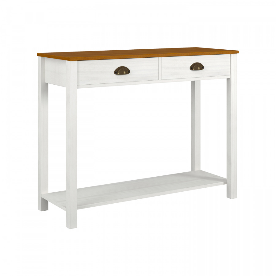 materiál masiv borovice, barevné provedení bílý / hnědý lak dvě zásuvky s kovovými úchytkami a pojezdy, jedna police