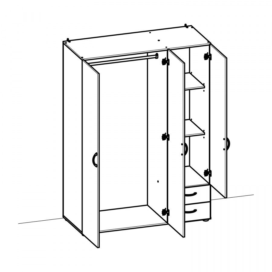 širší část šatní tyč, užší část 2 variabilní police, 2 zásuvky