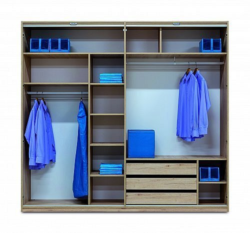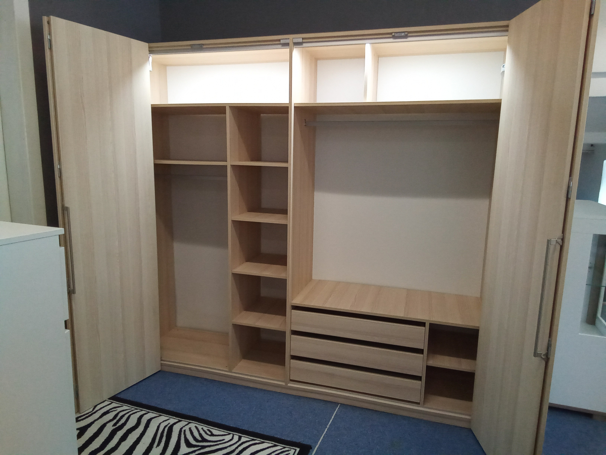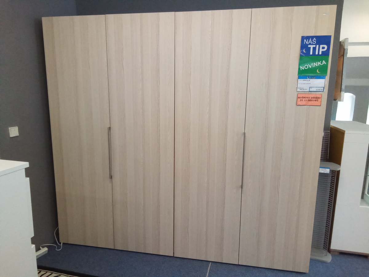 Samootevírací skládané dveře pro zážitky v nové dimenzi komfortu, z přístupněný celý obsah skříně pouhým jedním pohybem ruky s panoramatickým efektem. Skříň je doplněna o LED osvětlení (cena - 4220,-Kč) a 3x zásuvka do skříně š82, v13, h52(cena - 4140,-kč) již započítáno v ceně.Na objednání možnost i jiných variant a různých dekorů.Vystavený kus- AKÁCIE SVĚLÁ. Vyrobeno z lamina o sílem 18 mm s ABS hranami. Kvalitní kování a spojovací materiál je bez použití plastových součástek, vyjma ochranných krytek.